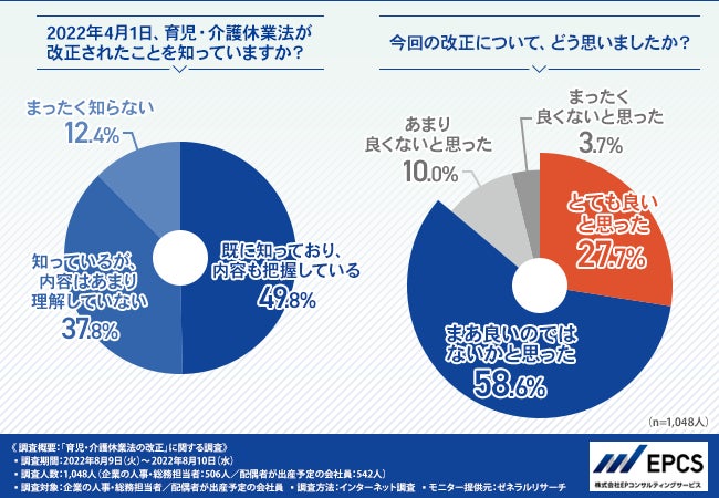 そこで、プロフェッショナルアウトソーシングサービスを提供する株式会社EPコンサルティングサービス(https://www.epcs.co.jp/)は、企業の人事・総務担当者/配偶者が出産予定の会社員を対象に、「育児・介護休業法の改正」に関する調査を実施しました。