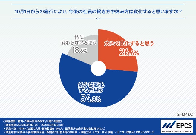 「10月1日からの施行により、今後の社員の働き方や休み方は変化すると思いますか?」と質問したところ、『大きく変化すると思う(26.6%)』『多少は変化すると思う(54.8%)』『特に変わらないと思う(18.6%)』という回答結果になりました。