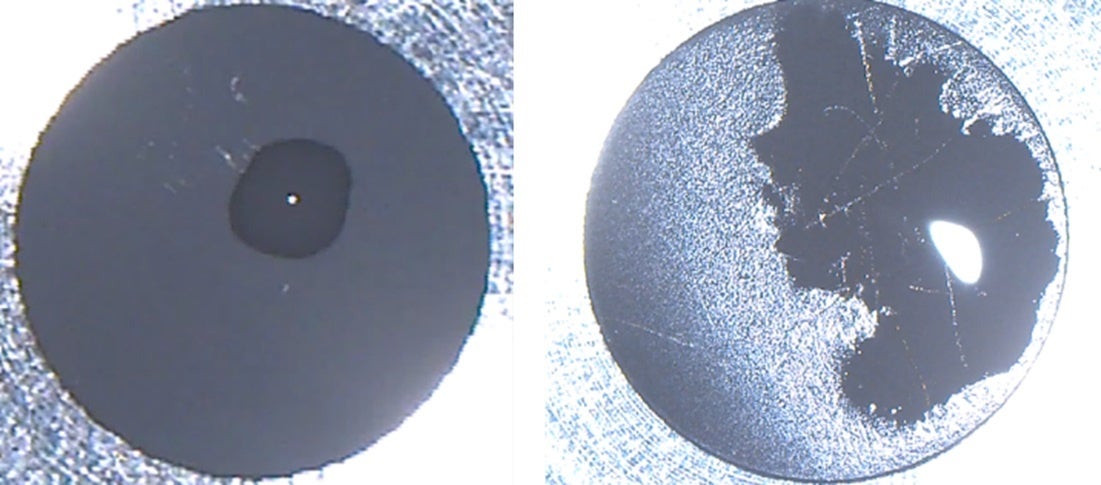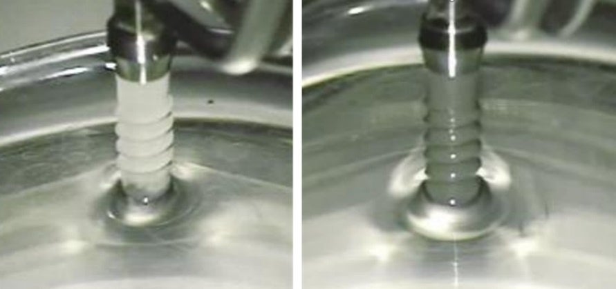 また、実際に利用されているスクリュー型インプラント材を用いて濡れ性試験を実施しました(図3)。処理前(左図)は疎水性を示し、水が下端部で留まりましたが、処理後(右図)では親水性に変化し、水がスクリュー表面を伝って上昇する現象が観察されました。