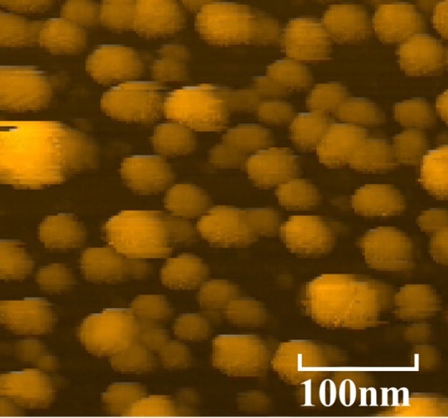一方、ナノバブルは水中に存在する極めて微小な気泡で、優れた持続性を持つ点が特徴です。図1は、原子間力顕微鏡(※3)を用いて、水溶液中に浮遊するナノバブルを観察した画像です。これらのナノバブルは直径10~20nmの球形粒子で、その表面には数ナノメートルの凹凸構造が確認されました。この物性から、ナノバブルは殻を持つ中空の粒子である可能性が高く、「ナノセル」とも呼ばれます。また、ナノバブル内部の気体を変えることで異なる機能を持たせることが可能であり、特にオゾンを包含させて作成したオゾンナノバブルはその強い酸化力が注目されています。