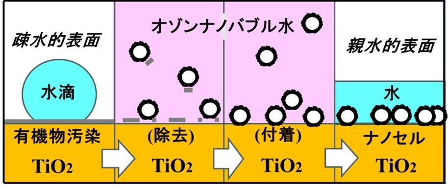 によるものです。有機物が除去されることで親水性が回復し、その後ナノバブルが表面に付着することで親水性が長期間維持されると考えられます。