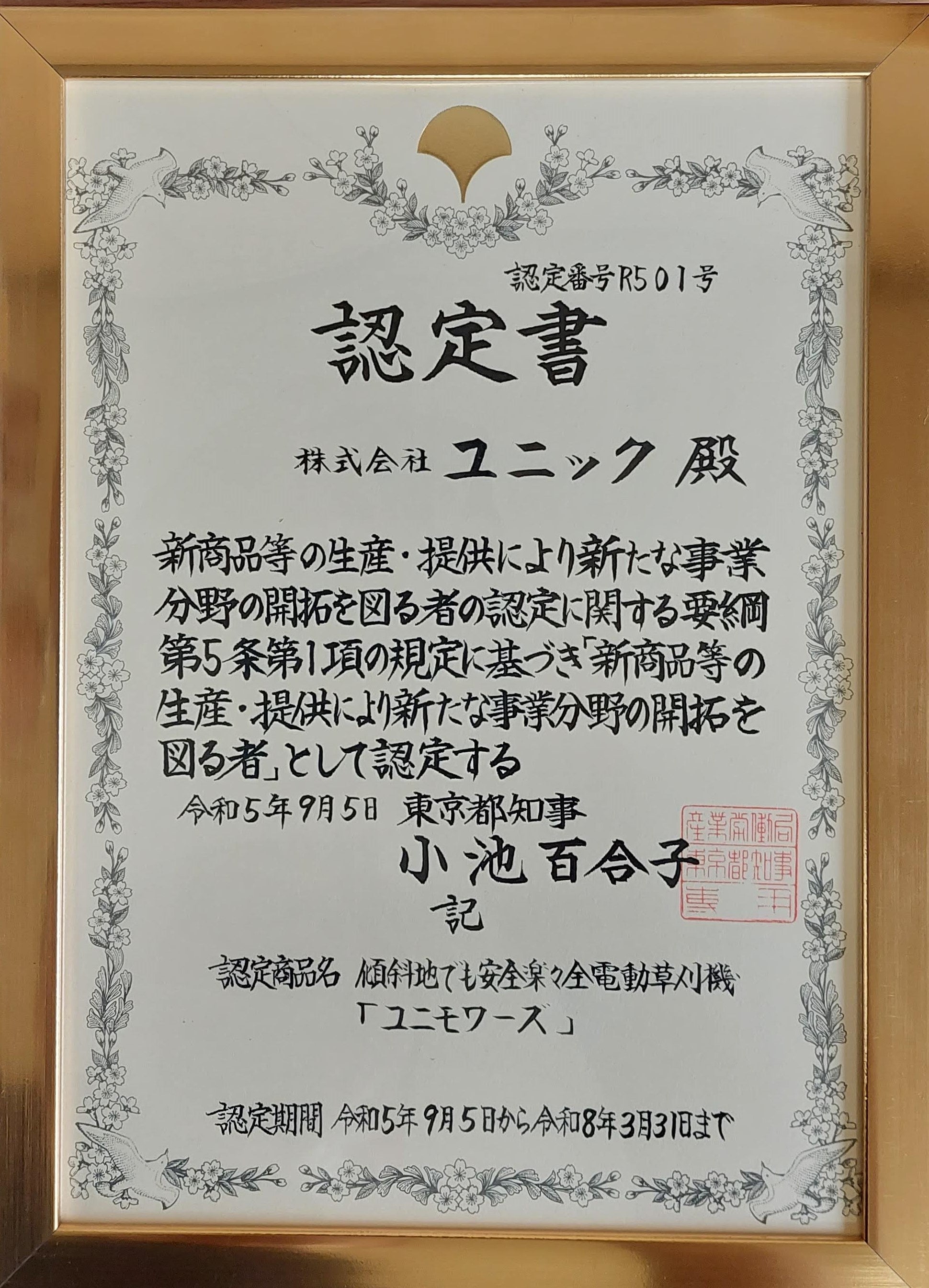 株式会社ユニック(代表取締役:竹内 幹夫)、および、ユニック製リモコン式電動草刈機(機種名:UNIMOWERS、読み方:ユニモアーズ)は、東京都が実施しているトライアル発注認定制度にて「新商品等の生産・提供により新たな事業分野の開拓を図る者」、および、その対象商品にとして認定されました。