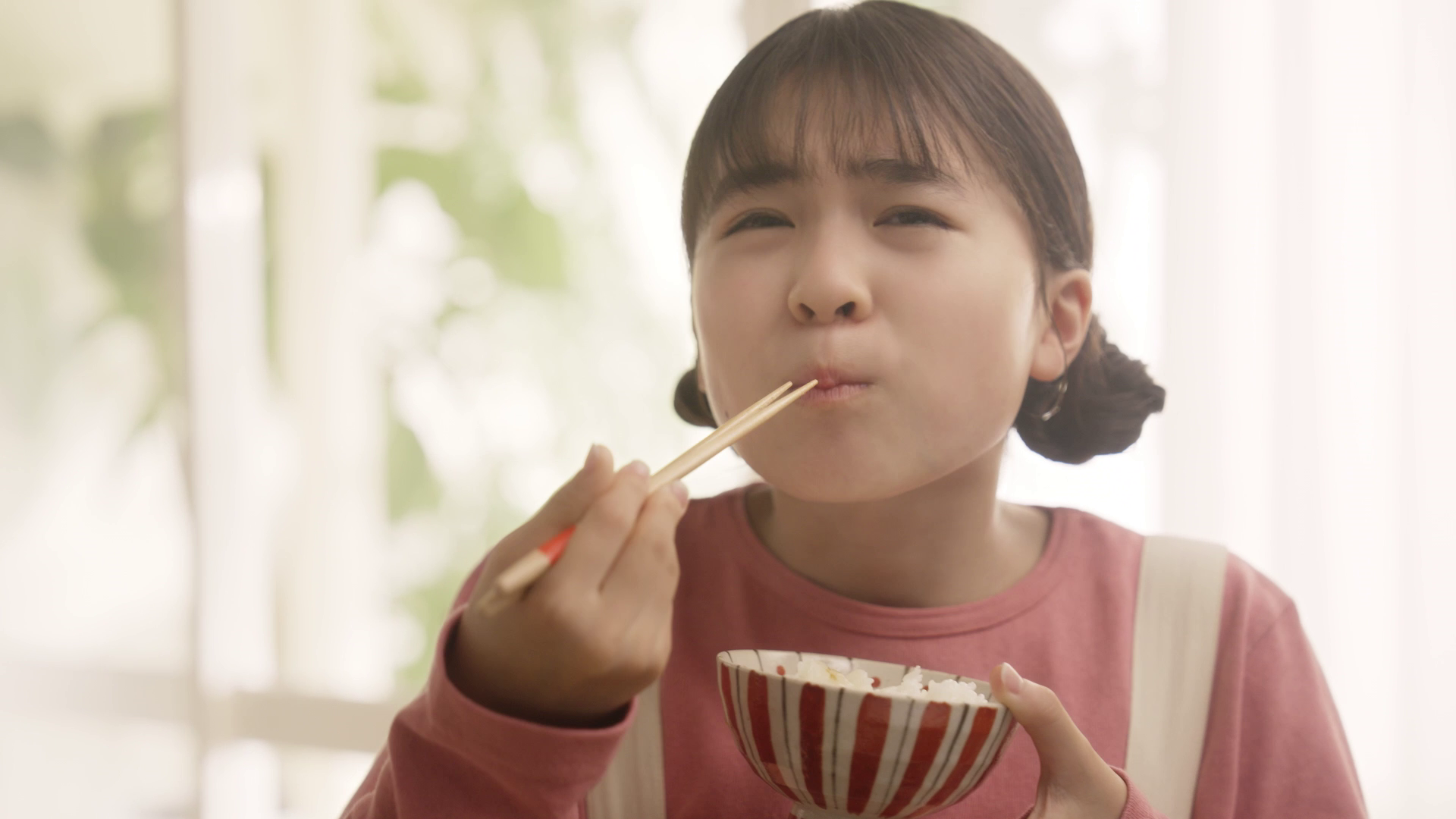 沢山のおかずと共に召し上がっていただきました。まず「銀河のしずく」が入ったおひつを開けたのんさんは『お米の白さが輝いて、銀河の星のようなキラキラしたお米です』とお茶碗によそい、お腹を空かせたのんさんは、口いっぱいに頬張ります。沢山のおかずとともに食べたのんさんは『とても美味しいです!良い甘みが広がって多幸感を感じてます』と満面の笑みでお召し上がりいただきました。