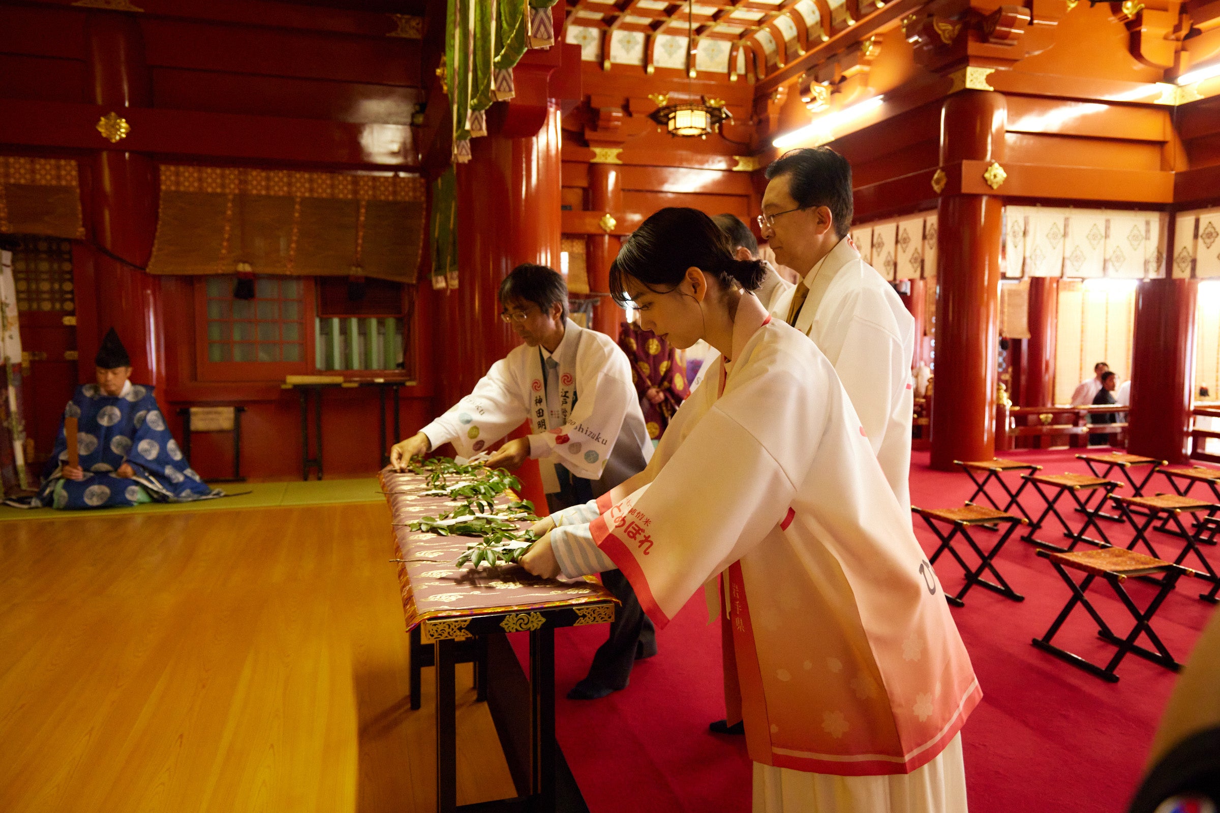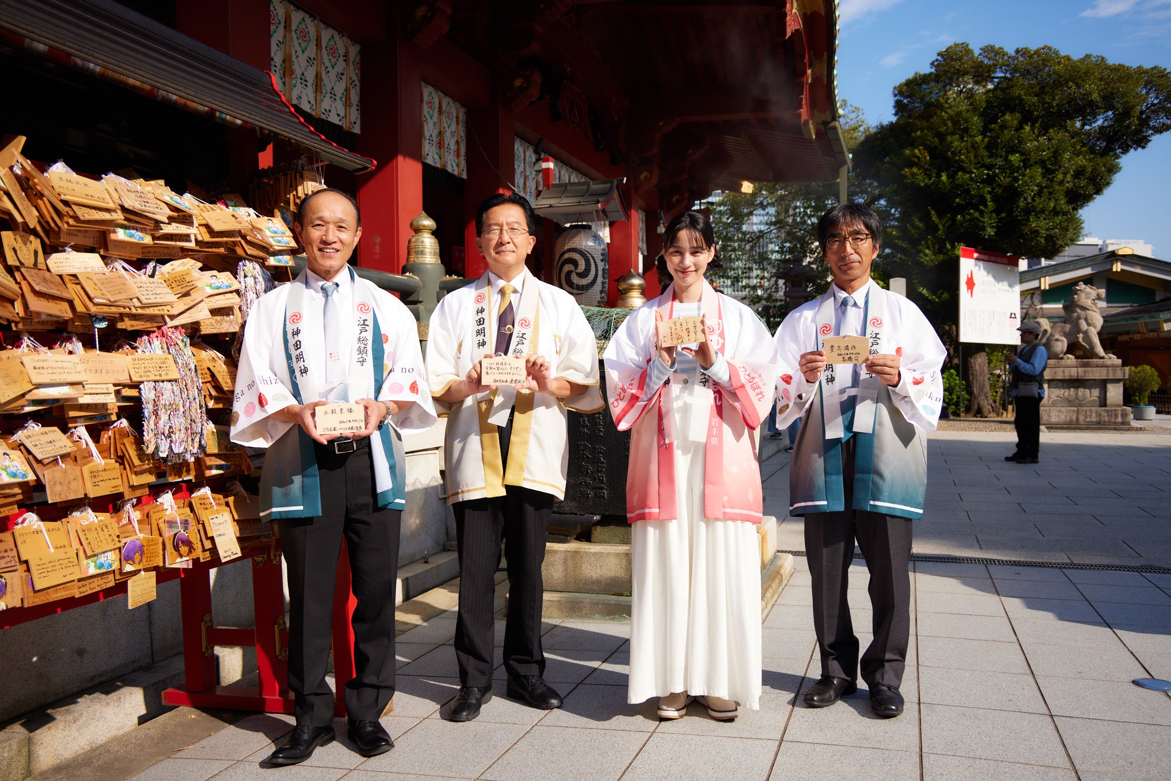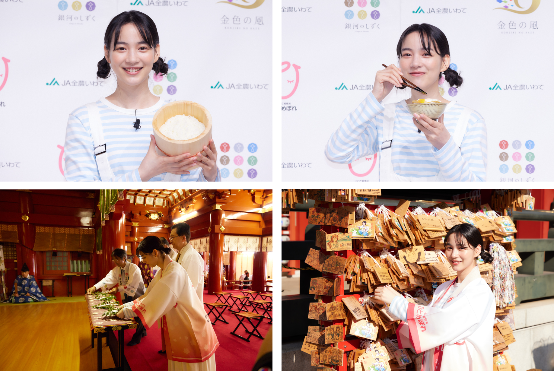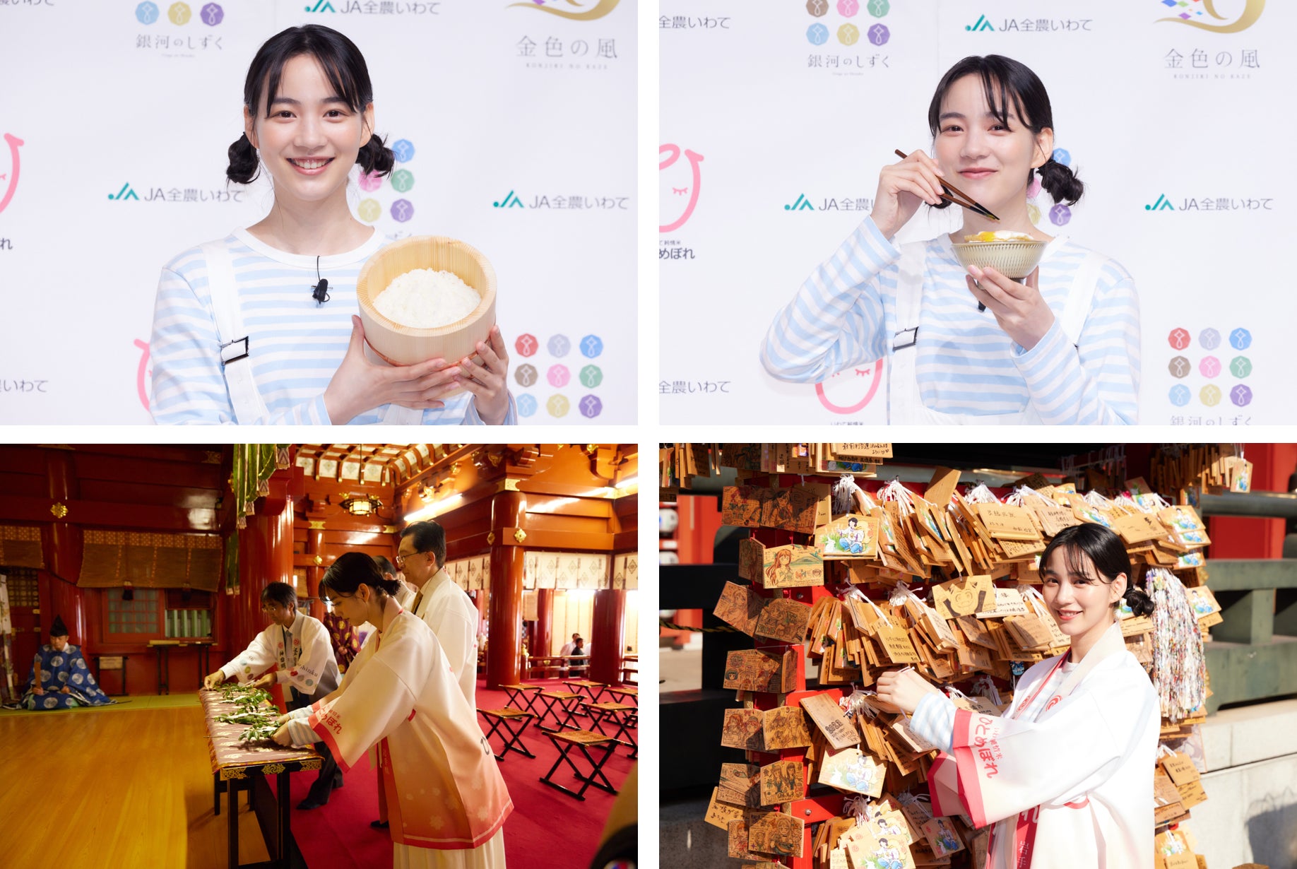 また、のんさんには新CM撮影時のエピソードや秋の楽しみ方をお話していただいたほか、「銀河のしずく」と「ひとめぼれ」の2種類を沢山のおかずとともに召し上がっていただきました。それぞれの美味しさを笑顔満点で伝えていただき、味わいについてご紹介いただきました。また、期間限定で全メニューが「銀河のしずく」とタイアップする“うなぎ藤田 白金台店”の女将も登壇し、達増知事には「うな重」をお召し上がりいただきました。最後には、「いわて純情米」がより多くの方に届くよう登壇者一同で絵馬に願い事を書き、その後神田明神へご祈祷いたしました。