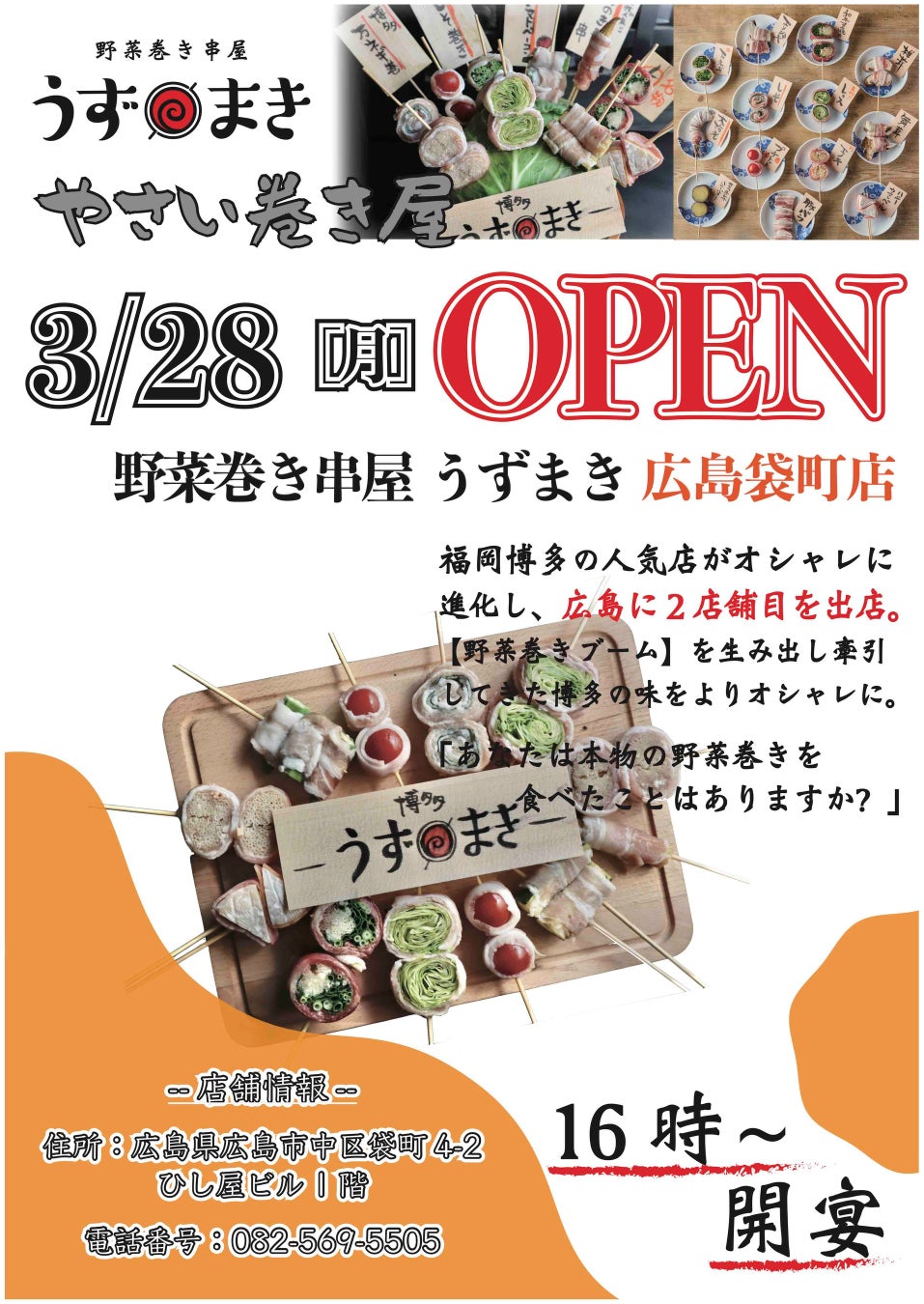 (本社:東京都中野区、代表取締役:周郷 海)は、《野菜巻き串屋《博多うずまき 広島袋町店》を《広島袋町》に《2022年03月28日(月)》にオープン致します。