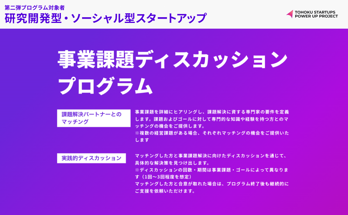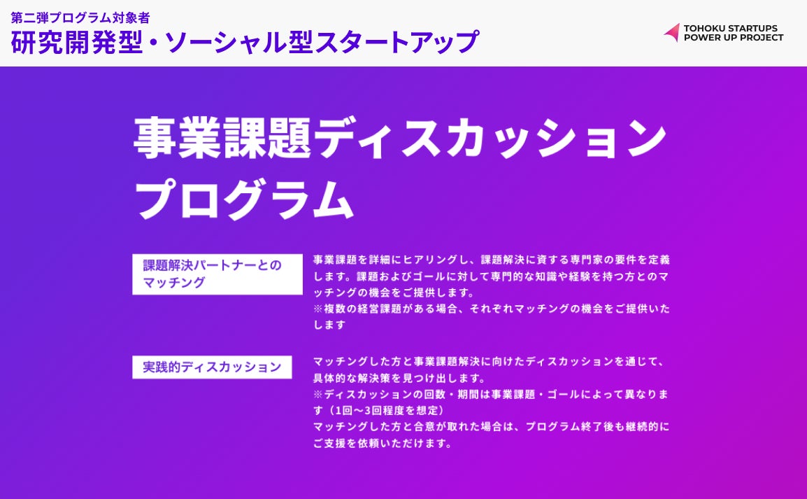 研究開発型スタートアップやソーシャルスタートアップの事業課題の解決に向けて専門的な知識や経験を持つ専門家とのマッチングや実践的ディスカッションの機会をご提供し、仙台・東北のスタートアップの事業の成功確度の向上を目指します。