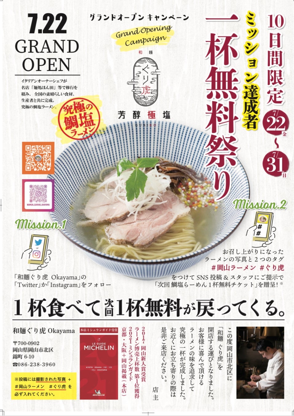 ミシュランガイド掲載ラーメン店 「麺処ぐり虎」の新ブランド「和麺ぐり虎」が岡山市に初出店!7/22(金)グランドオープン!!