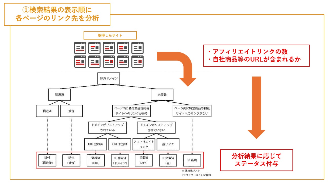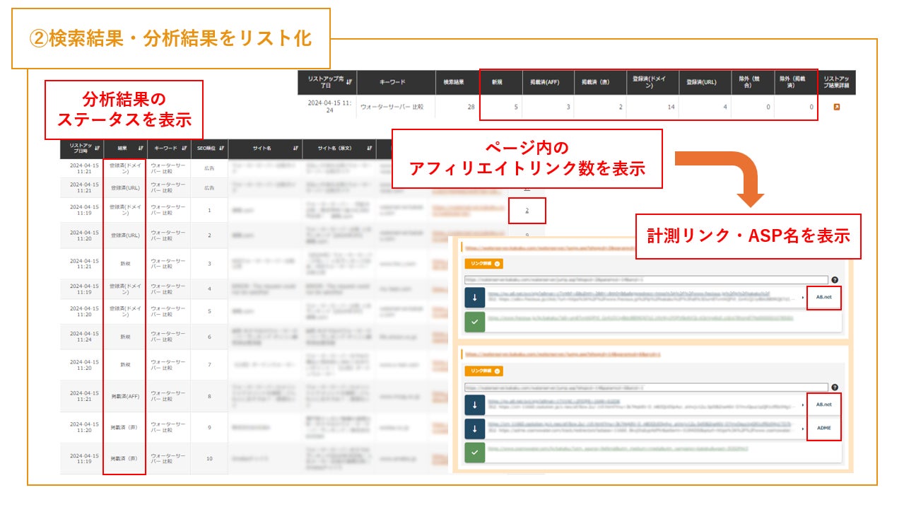 特定のキーワードで表示されるサイト上に自社商品などの特定サイトへのURLが掲載されているかどうかを分析し、その結果をステータスとして表示させる技術です。また、どのアフィリエイトASP経由のアフィリエイトリンクが貼られているかも検出可能です。
