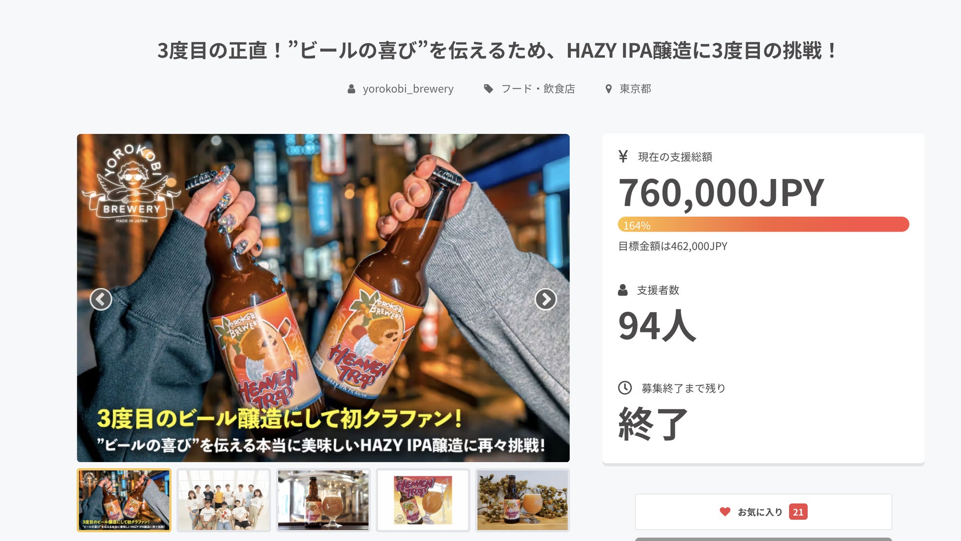 YOROKOBI BREWERYは、2021年2月にプロジェクトスタートし、現在3回の酒造を完了しております。2回目までの酒造で思い描く「Hazy IPA」を酒造することができず、酒造を続けるためにクラウドファンディングを実施。たくさんの方に支えられ、開始16時間で目標金額を達成、最終的に目標金額の164%達成。