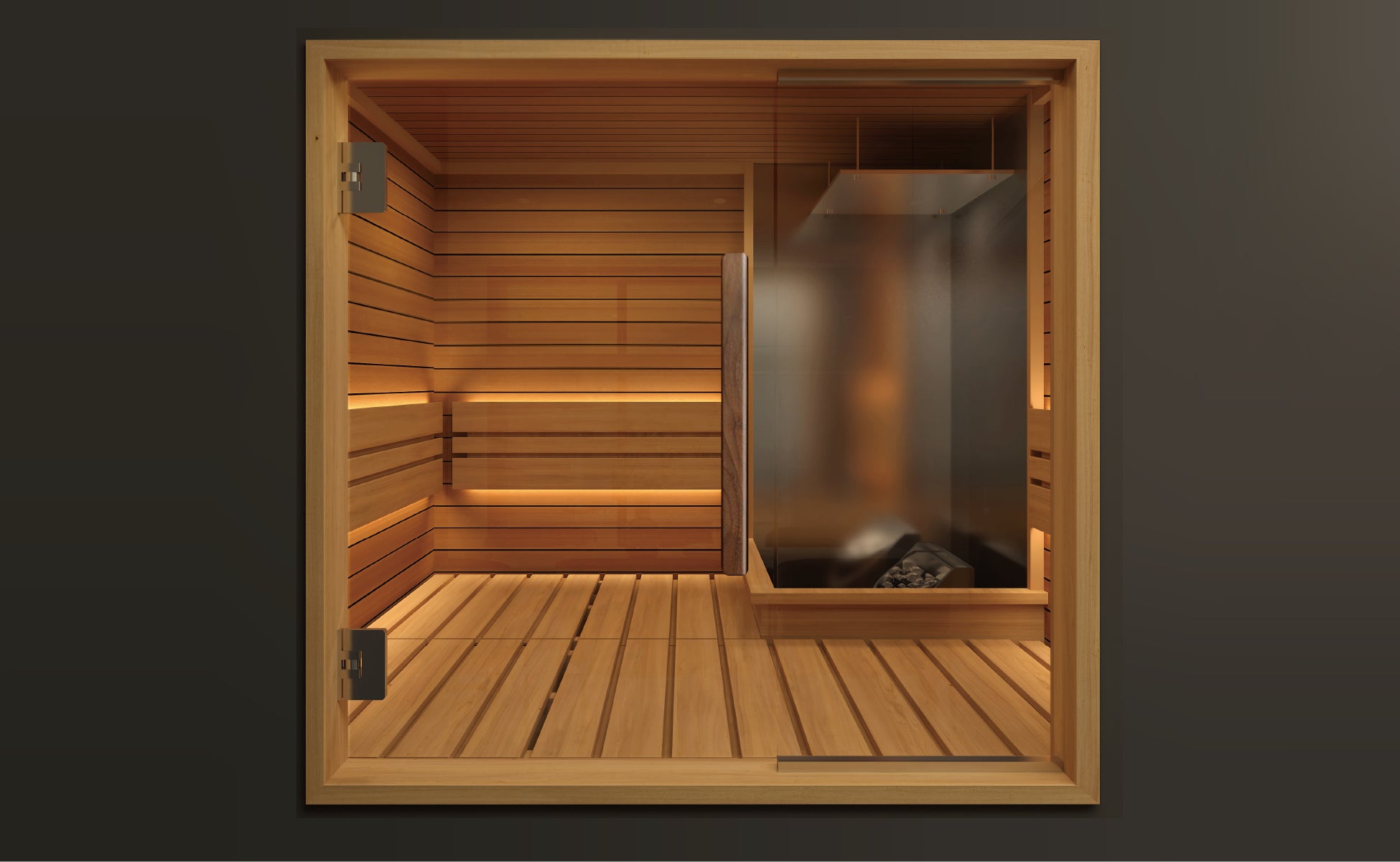 段差のないフルフラットタイプのサウナ室です。どこに座ってもほぼ均一の温度で楽しめます。自由に寝そべるだけでなく、まるで自宅のように寛ぎながらサウナを楽しむこともできます。月替りのアロマでセルフロウリュも楽しめます。