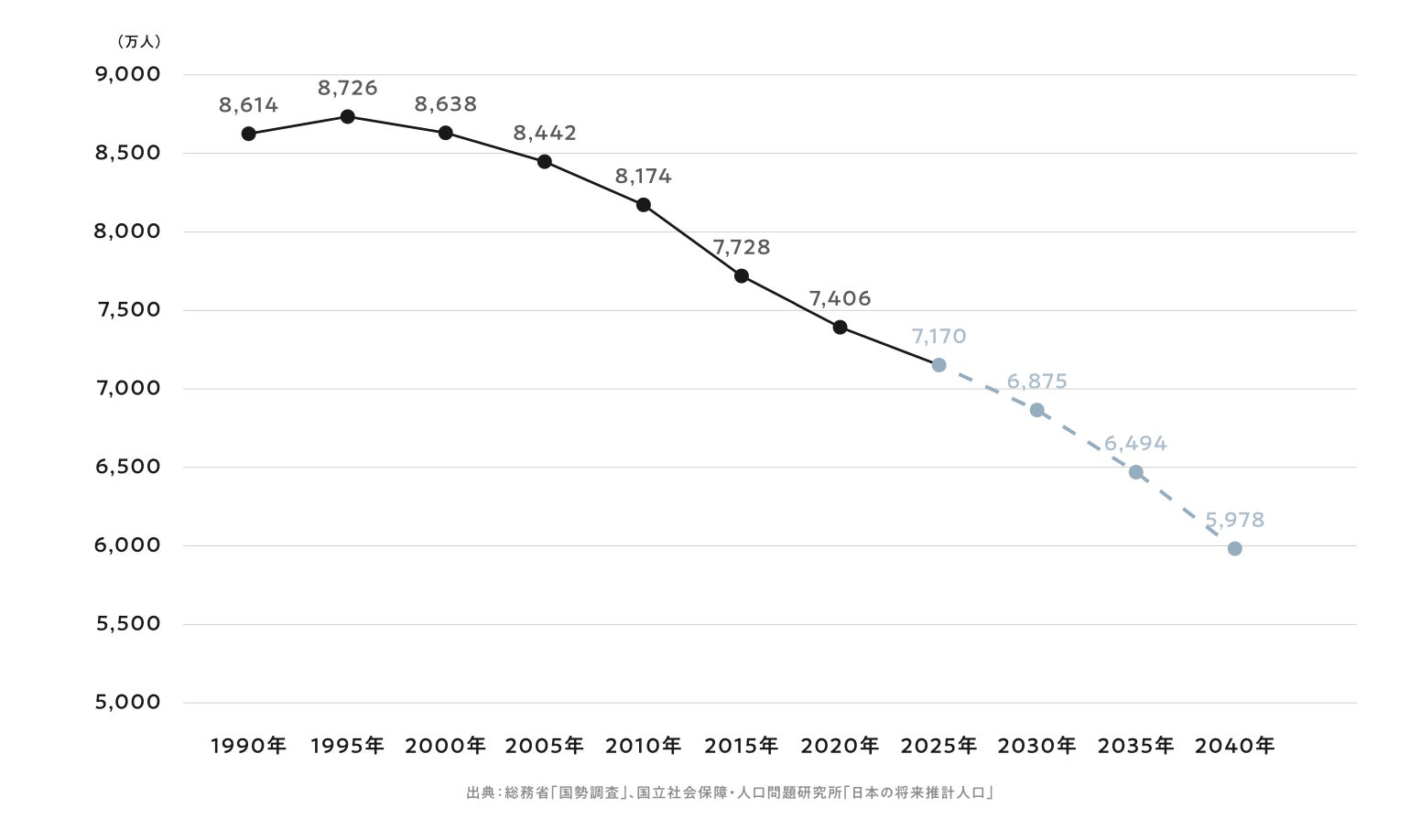 日本では労働生産人口(15〜64歳の就業可能な人口)が、急激に減少しています。これは少子高齢化の進行により、若年層の労働者が減り、高齢者が増えていることが原因です。この減少傾向により、企業は従来の採用方法では十分な人材を確保できなくなっているのが現状です。今後さらに従業員が会社に定着することが人材戦略の鍵となります。(総務省 国勢調査)