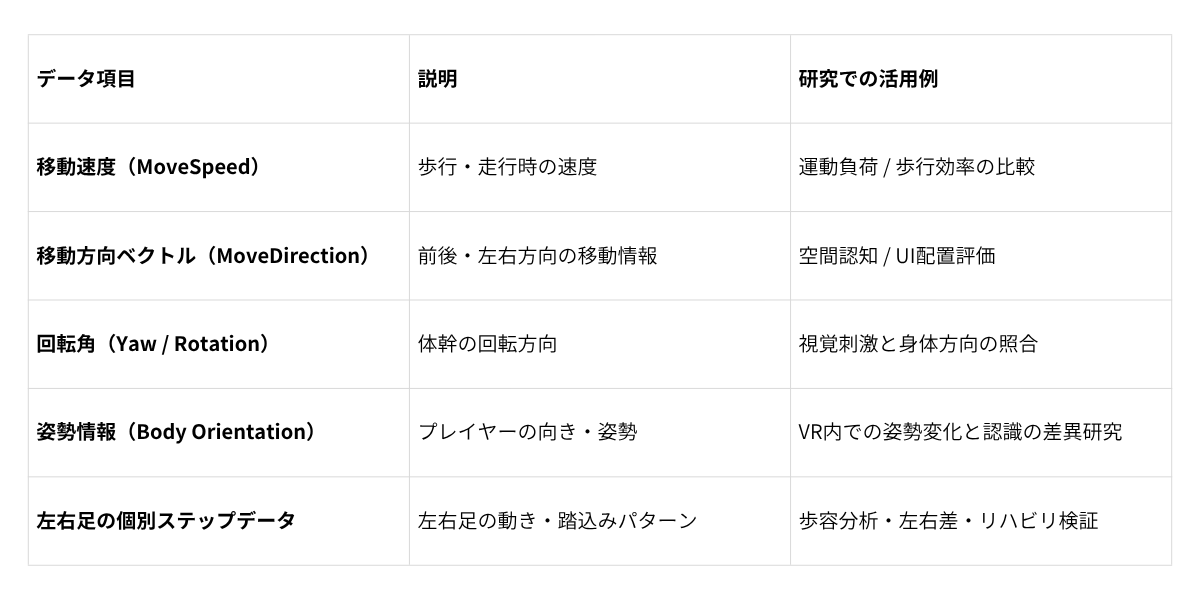 これにより、VR内での動作と現実の身体運動を同期的かつ定量的に評価できます。