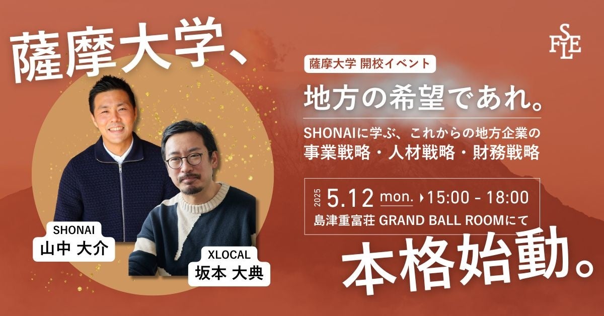 NPO法人薩摩リーダーシップフォーラムSELF(所在地:鹿児島県鹿児島市、代表理事:野崎恭平、古川理沙、須部貴之)は、鹿児島の地域企業・経営者のための新たな学びと実践の場「薩摩大学」を本格始動いたします。その狼煙(のろし)となる開校記念イベントを、2025年5月12日(月)にマナーハウス島津重富荘(鹿児島市)にて開催。ゲスト講師には、山形県庄内から地方創生のフロントランナーとして全国的な注目を集める株式会社SHONAIの代表取締役 山中大介氏と、同社取締役であり株式会社XLOCAL代表取締役の坂本大典氏をお招きし、「地方の希望であれ - SHONAIに学ぶ、これからの地方企業の事業戦略・人材戦略・財務戦略-」と題して、未来を切り拓くためのリアルな知見を共有いただきます。本プレスリリースでは、薩摩大学設立の熱い想い、記念すべき第一歩となる5月12日のイベント詳細、そして薩摩大学が鹿児島に描く未来像についてご紹介します。