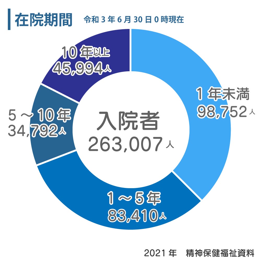 2021年の630調査によると、日本には精神科病床が30万床あり、263,007名が入院中でそのうち132,481名が強制入院、つまり自分の意思によらない非自発的入院です。