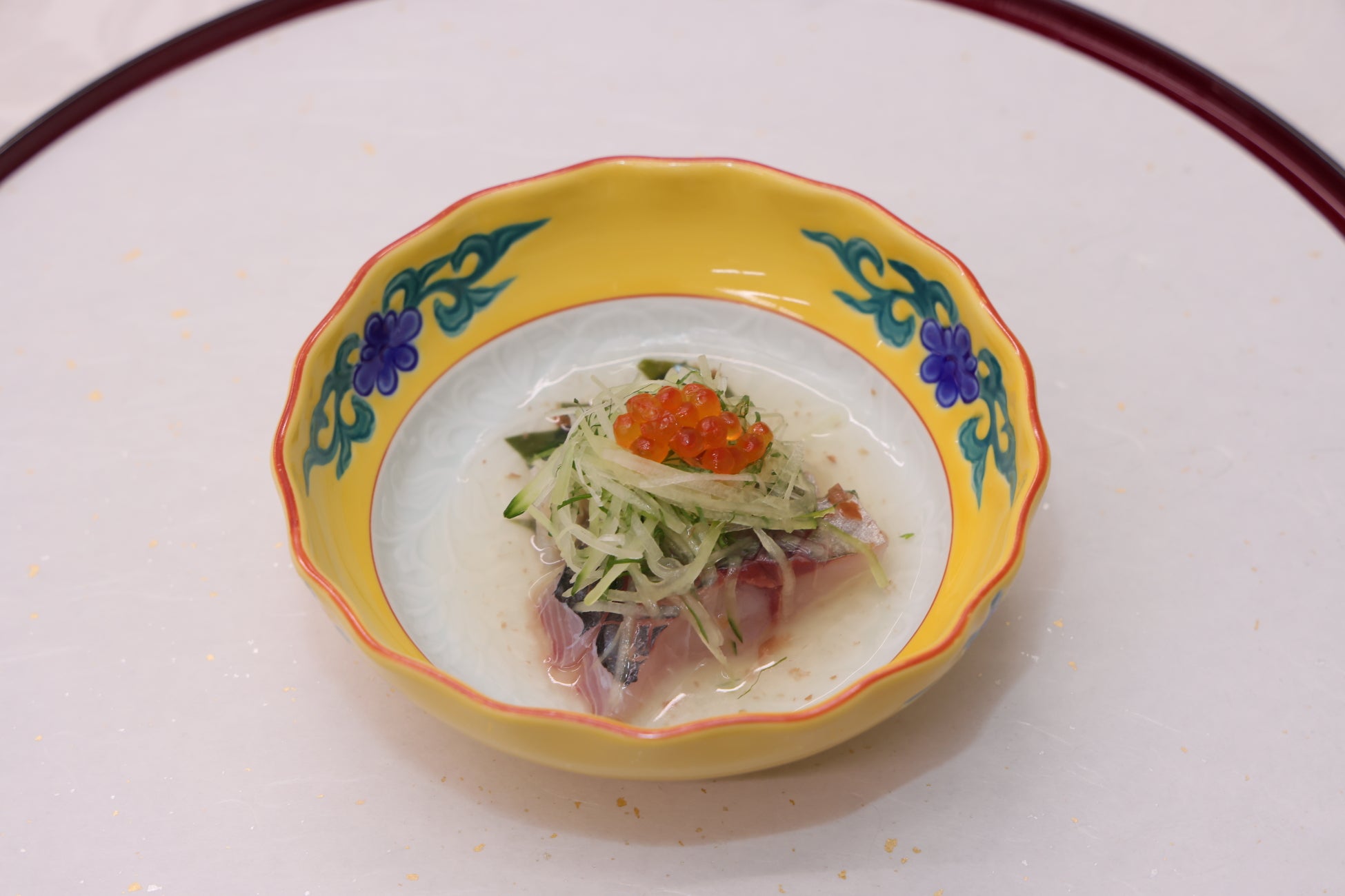 続いてホテルメトロポリタンエドモント和食料理長丸浩史氏による県産魚を使用した5つの料理「本日朝どれのアジ昆布〆と能登とり貝のサラダ仕立て」 「ハタハタ焼き浸し」 「三種えび食べ比べ(甘海老、ガスエビ、白トラエビ)」 「炙りサワラと金時草 玉葱ドレッシング」 「鰤と木ノ子ご飯」が披露されました。