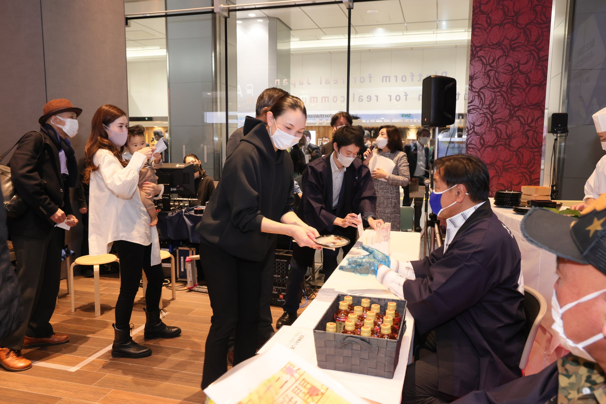 冒頭馳知事より会場内の事業者に向けて「私も乗ってきた北陸新幹線を使った輸送サービスで届けた今朝獲れの魅力ある新鮮な魚介類を存分に味わっていただき、今後の積極的なお取引やご利用、PRをお願いしたい。」と挨拶が行われ、続いて石川県漁業協同組合代表理事組合長笹原丈光氏による石川県産の地酒「百万石乃白の地酒」で乾杯を行いました。