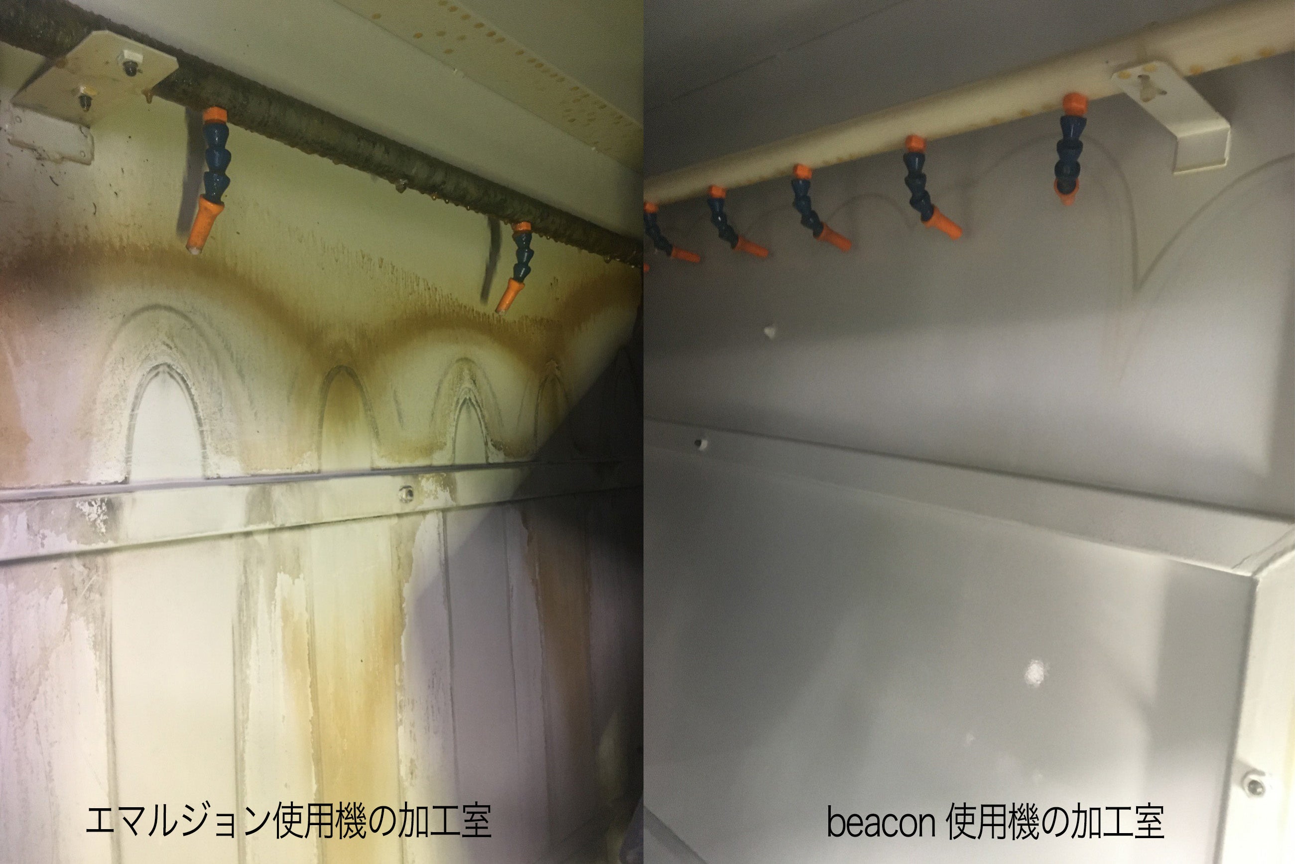 ・エマルジョンからビーコンに替えて変わったのは、クーラントが臭わなくなったこと。クーラントの腐敗がなく液寿命が伸び液交換の手間・費用が減った。