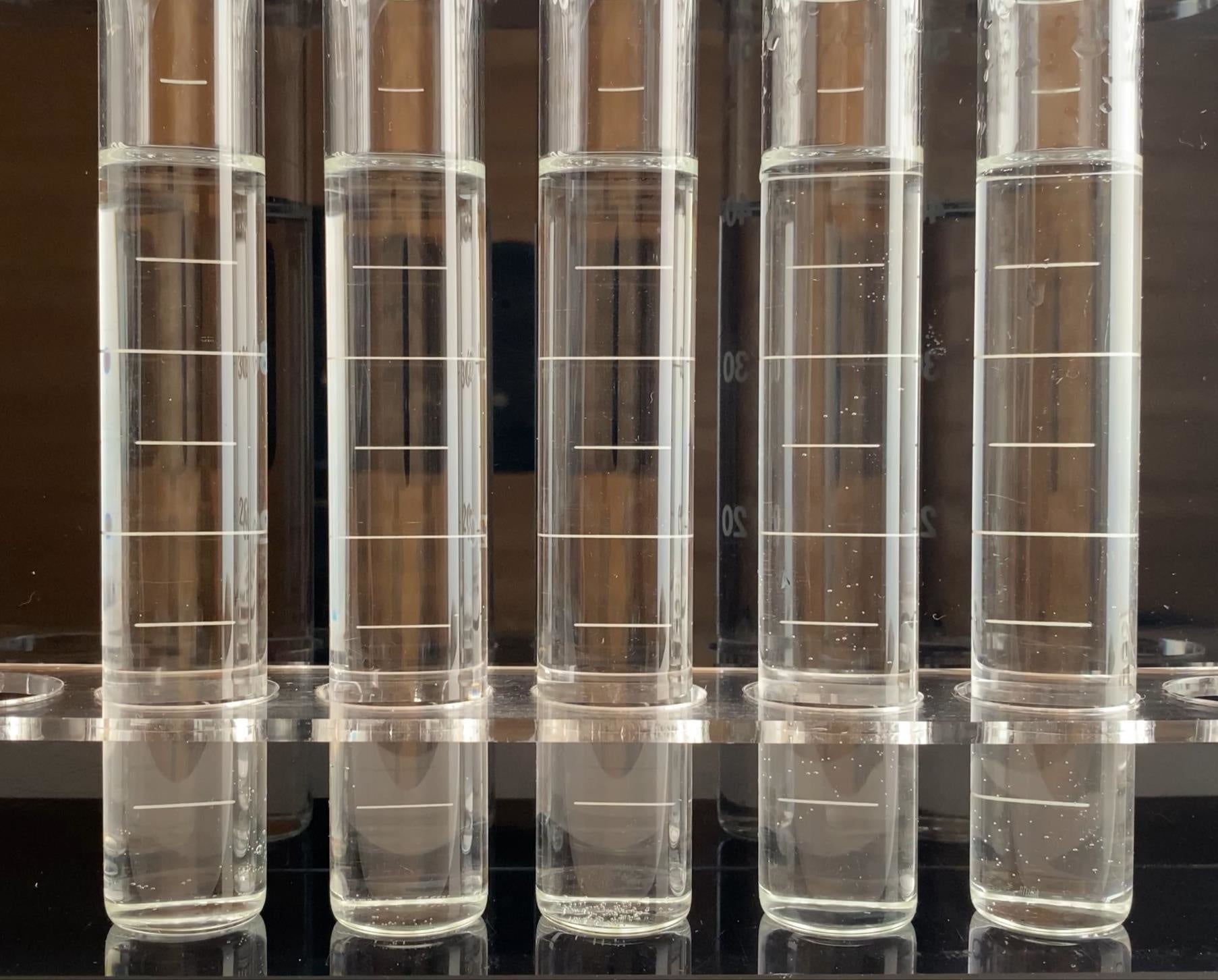 beaconの開発でこだわったのは「クーラントの希釈作業の手間を無くすこと」。切削加工現場の無駄を無くすために重要なポイントとなります。「透明に溶ける」ということは「水への分散性に富む」ということです。そのためには水への投入時、沈殿や浮遊をさせないようにするというのが必須となります。透明に溶ければタンク内のクーラントの質は高まり、きれいが持続します。きれいが持続すれば交換の回数も減らすことができ、汚れ作業を伴う劣化時の交換を大きく減らすことができます。