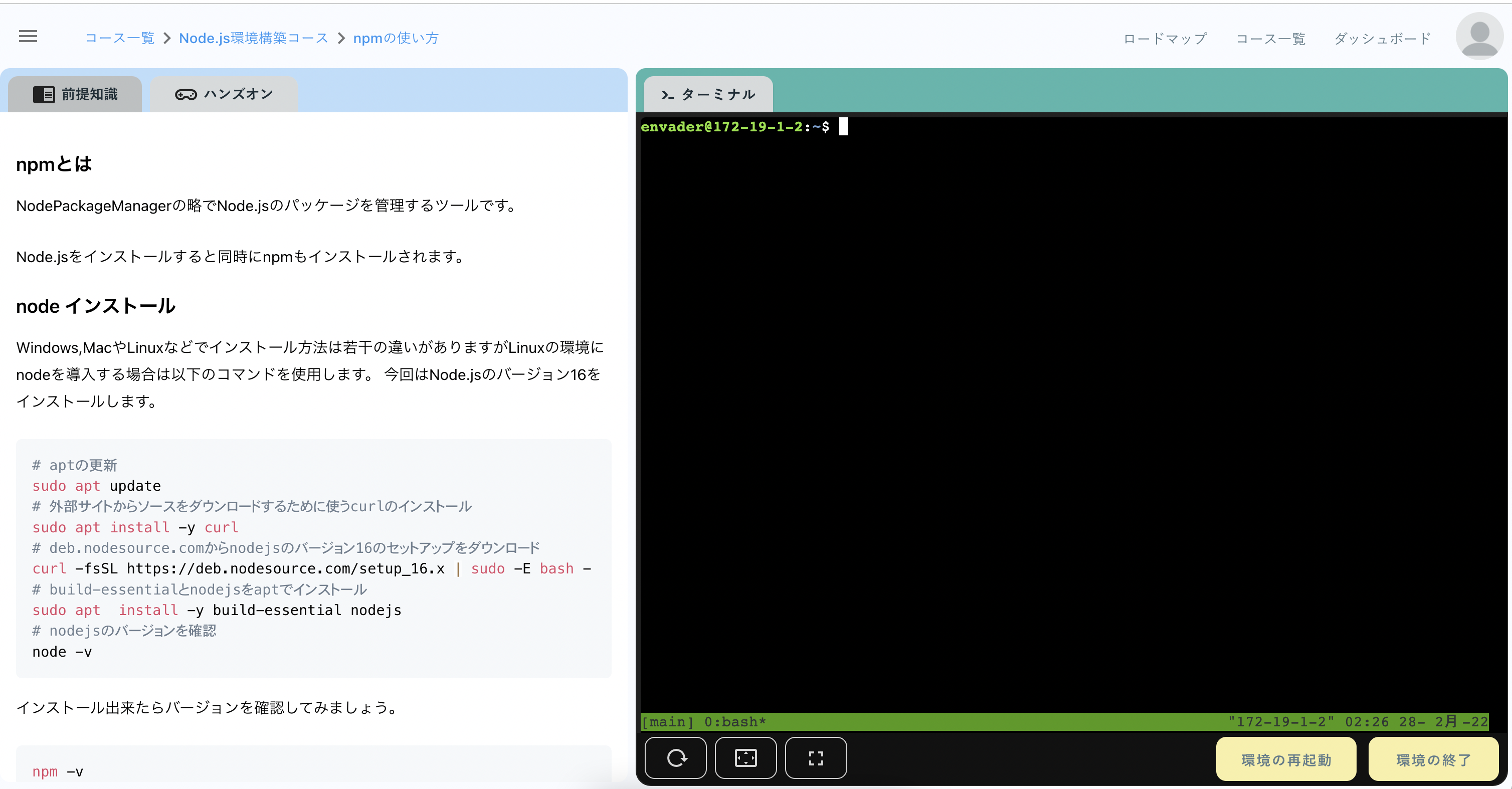 そこで、Envaderでは、Node.jsに特化した環境構築のコースをリリースしました。ボタン一つですぐに始められ、また壊れてもまたボタン一つでやり直せる環境にて学習を重ねることで、環境構築をマスターすることができます。