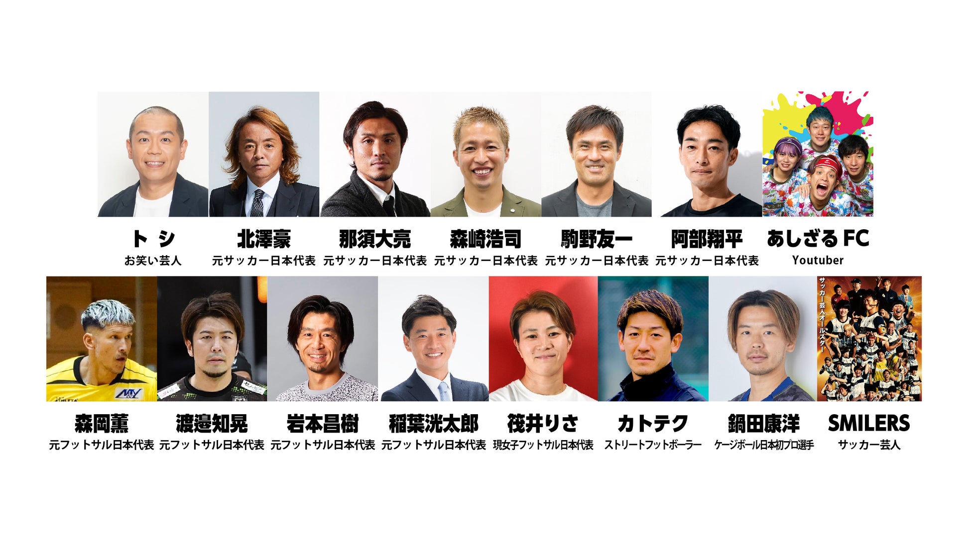 発起人の1人でもあるタカアンドトシトシの総合MCをはじめ、元サッカー日本代表からは解説など多方面で活躍する北澤豪、大人気YouTuber那須大亮や、ワールドカップにも出場し長年日本代表を牽引した名サイドバック駒野友一、サンフレッチェ広島のレジェンド森崎浩司、名古屋グランパスでJ1を制覇した阿部翔平。そして元フットサル日本代表からは、4度のFリーグディビジョン1のMVP&得点王に輝いた森岡薫(ペスカドーラ町田)やFリーグディビジョン1で得点王に輝いた渡邉知晃、現役女子フットサル日本代表の筏井りさ(バルドラール浦安)、その他豪華ゲストが登場。さらには子供に絶大な人気を誇る現役フットサル選手YouTuberあしざるFCとサッカー芸人オールスターチームSMILERSも昨年に引き続き参戦します。