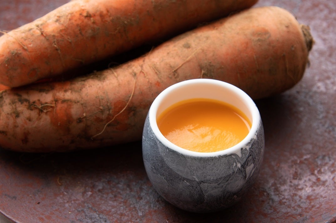 人参の水分をしっかりと抜くことで、人参の甘みをギュッと凝縮させ、皮も使用することで、旨味と栄養素を残します。シンプルだからこそ、使用食材の分量、丁寧な工程にこだわり、人参の甘みを前面に出したポタージュに仕上げました。