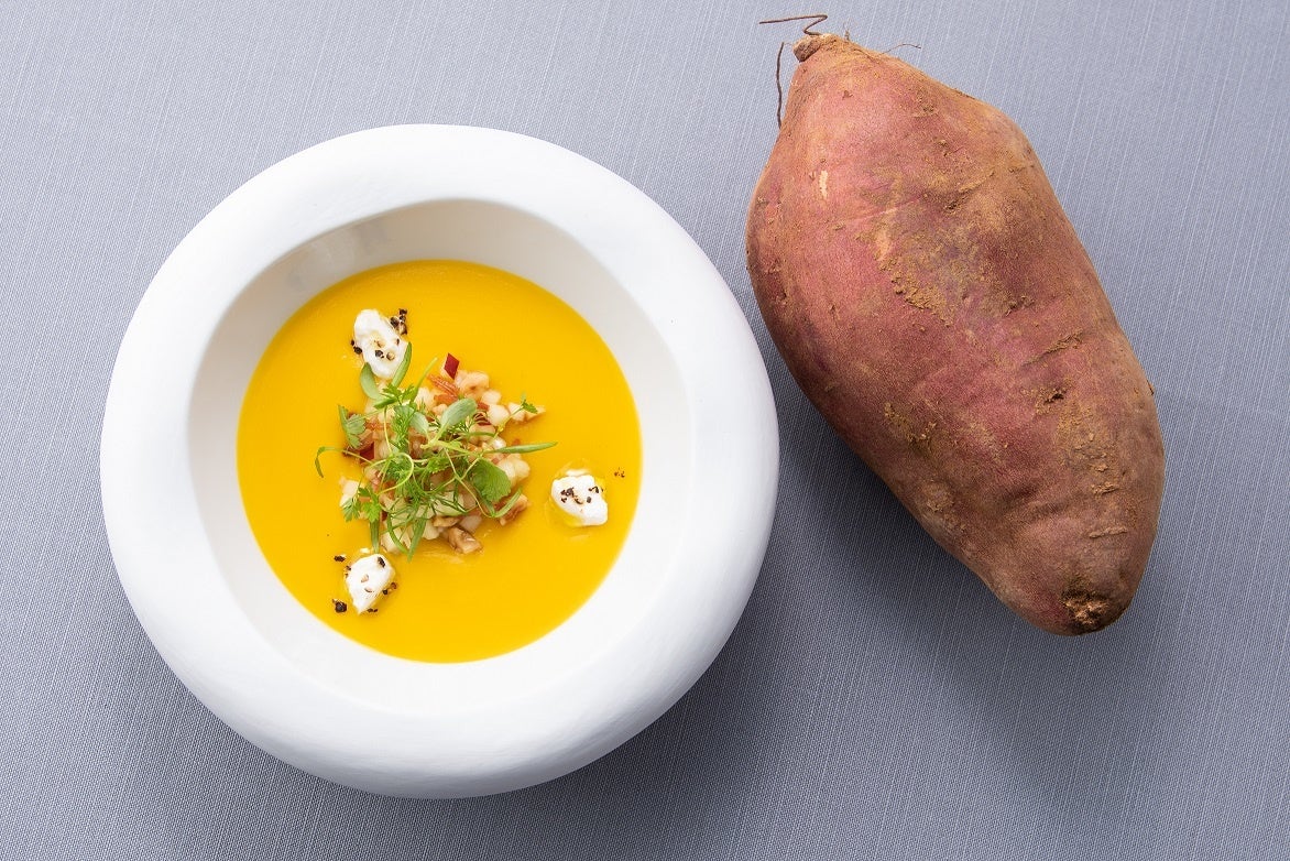 ハロウィンスイートはサツマイモの一種ですが、普通のものよりβカロテンが100倍含まれていることから、健康サツマイモとも呼ばれています。熱を加えることで綺麗なオレンジ色に変わり、甘みと香りが際立ちます。滑らかな舌触りも特徴的で、今回はベーコンとたまねぎ、少量の塩を加えることで、シンプルながらに洋風のコクのあるポタージュに仕上げました。