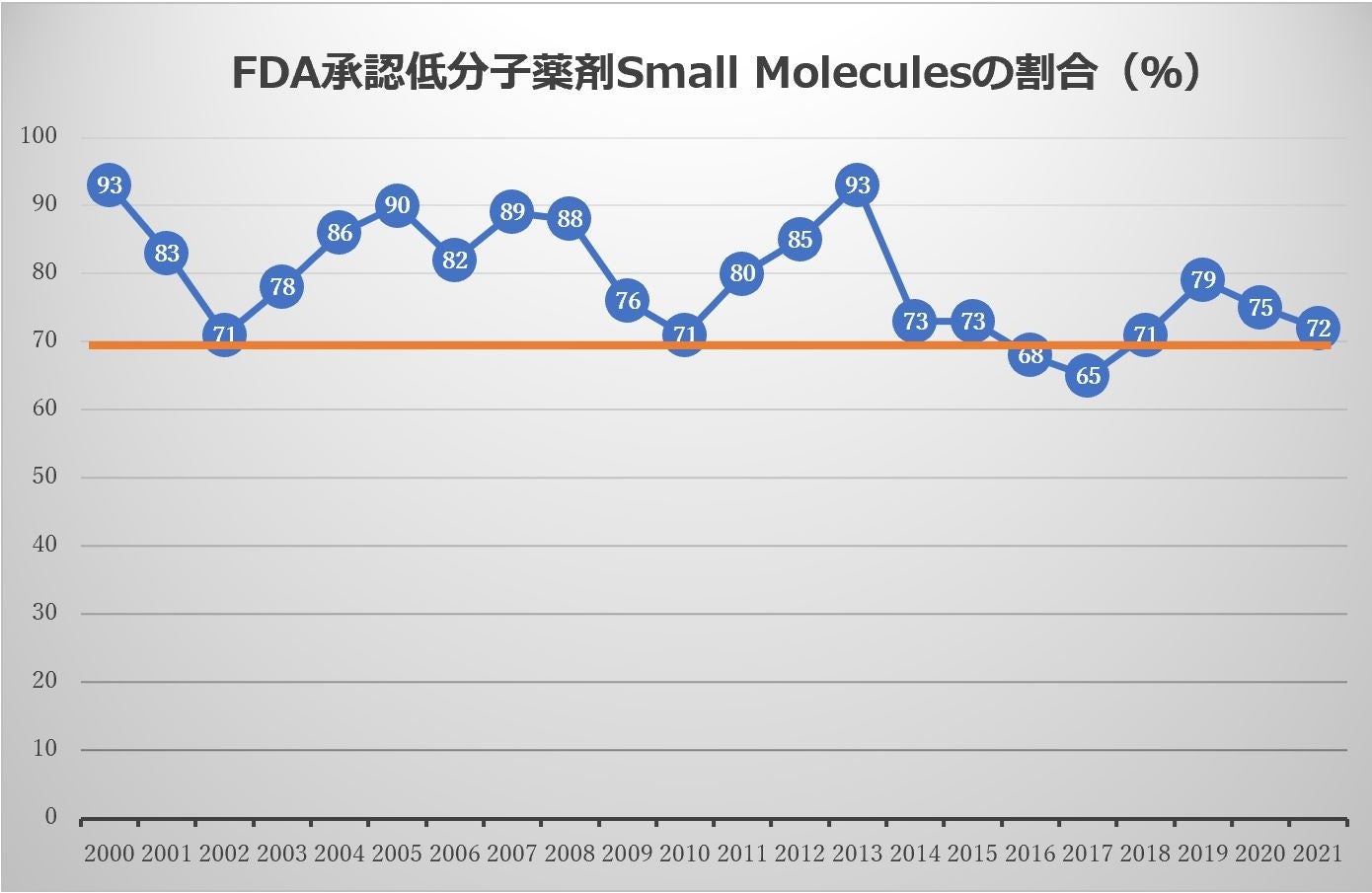 総合的創薬研究支援活動を世界中で展開しているSygnature Discoveryでは、主に低分子薬剤の創薬研究開発を行っています。昨今の日本の創薬研究では、オープンイノベーション活動活発化の流れも受け、21世紀初頭から抗体薬剤、核酸医薬やワクチンなど薬剤モダリティの多様化傾向が進み、研究費の多くがこれら多様化したモダリティ化合物研究開発に投入される傾向が見られています。その一方で、Beatriz G. de la Torre氏とFernando Albericio氏らにより最近発表された論文*によると、FDAで承認された薬剤のほぼ7割以上は継続的に低分子薬剤であるという興味深い状況も報告されています。