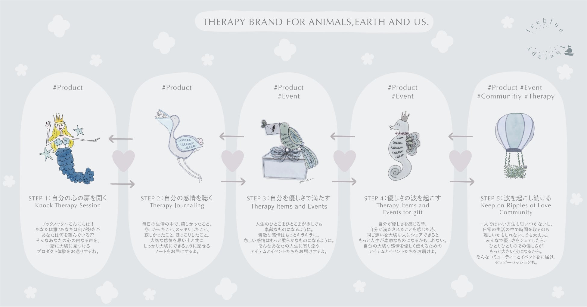 Iceblue Therapy独自の5STEPで、やさしさの波を起こし続け、 動物・地球・私たちを癒します💎
