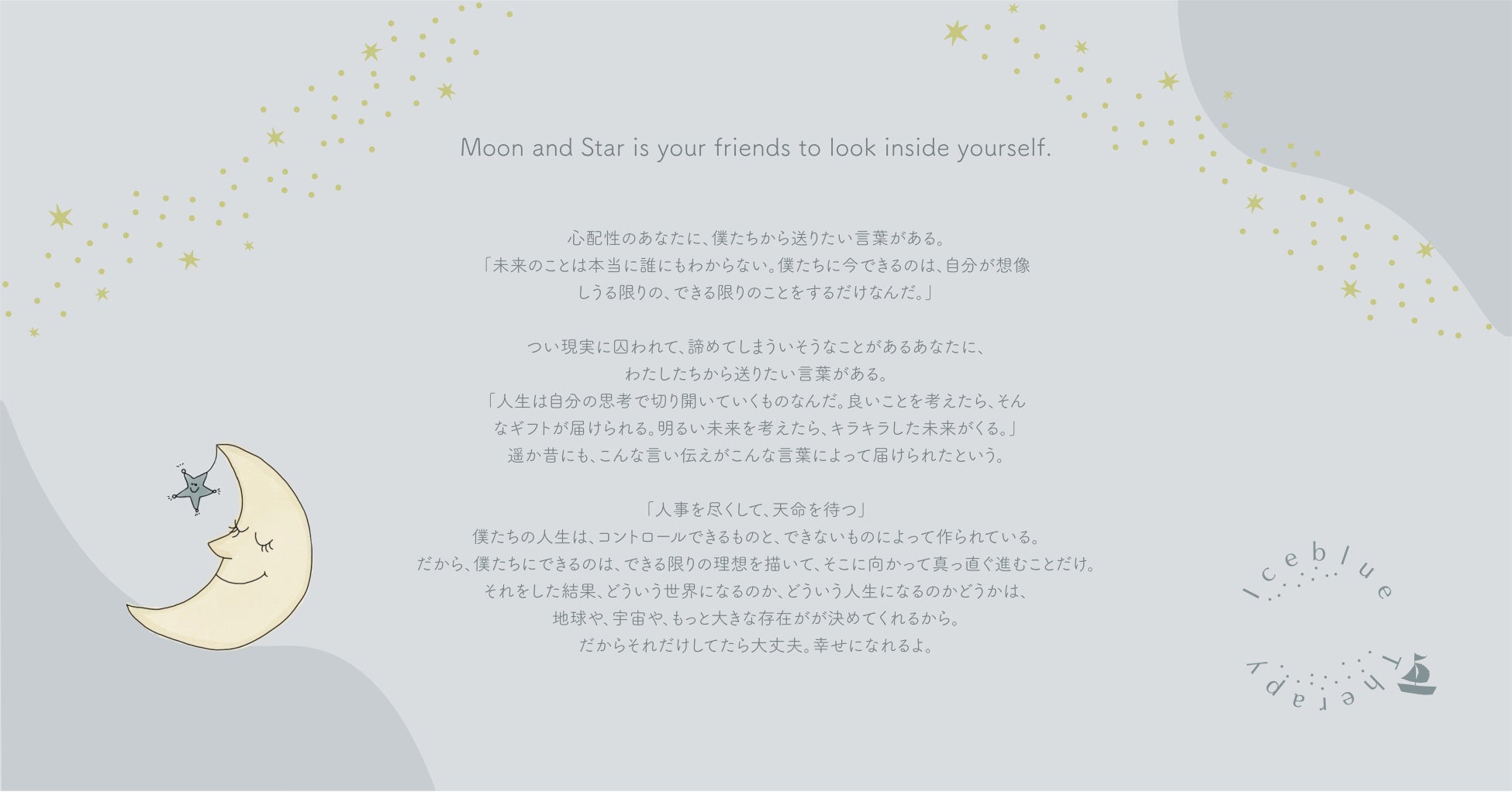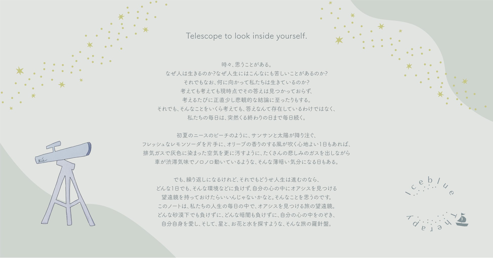 「Iceblue Therapy Note」は、あなたのためのセラピージャーナリングノートです。ジャーナリングを進めると、まるでセラピーを受けたかのような穏やかで軽やかな気持ちに、望遠鏡と月星が導いてくれます。