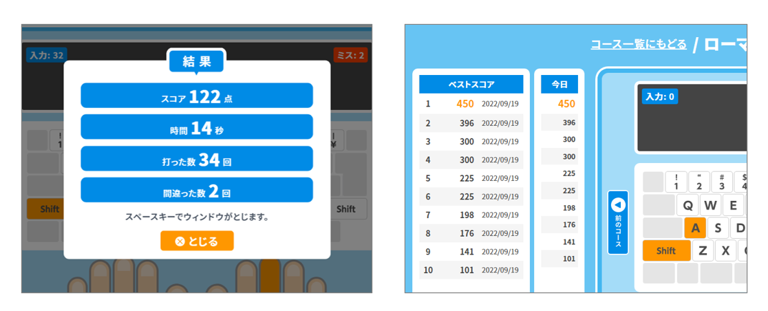 とかく挫折しやすいタイピング練習ですが、スコア履歴を記録することで、「前回より1点でも高くしたい!」とモチベーションを維持します。