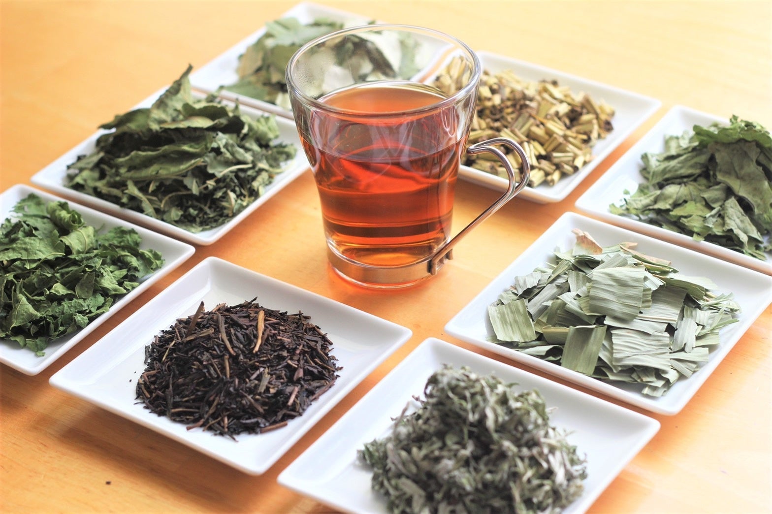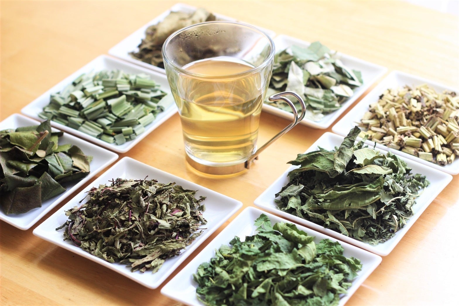 使用している茶葉:蓮の葉と茎・ローゼルの葉・ビワの葉・イチジクの葉・桑の葉・マコモの葉・柿の葉