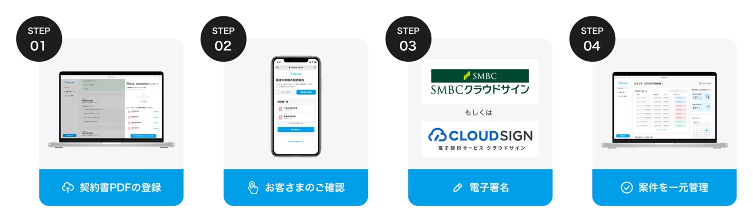 ※本サービスは、契約プラットフォーム事業を展開する SMBC クラウドサイン株式会社が提供する電子契約サービス「SMBCクラウドサイン」、および弁護士ドットコム株式会社が提供する電子契約サービス「クラウドサイン」とのAPI連携を通じ、契約書類の電子化を実現しています。レリーズのご利用には、別途SMBCクラウドサイン、またはクラウドサインのご契約が必要となります。