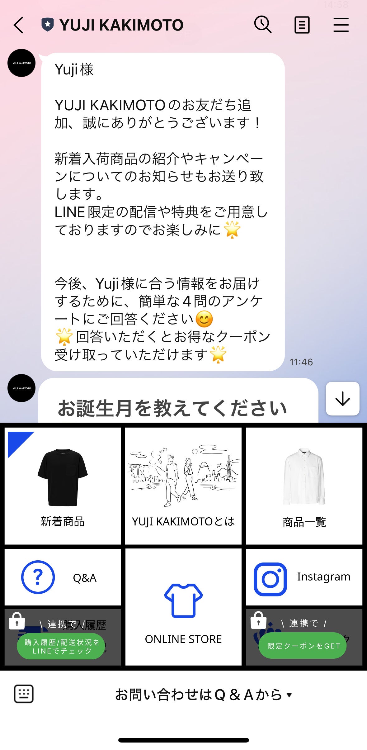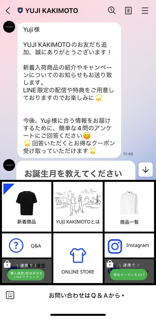 は、自社ブランド「YUJI KAKIMOTO」(https://yujikakimoto.com)の公式LINEアカウントを開設いたしました。新商品のお知らせやクーポンの配布、購入額に応じて還元率をアップするなど、ユーザーとの繋がりを強化するきっかけにしたいと考えています。