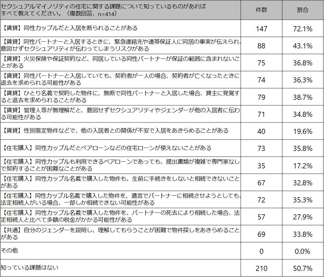 一方で、「知っている課題はない」と回答した割合も50.7%に上り、当事者の住まい探しの課題の潜在的なリスクが、約半数の方には認知されていないことも明らかになりました。