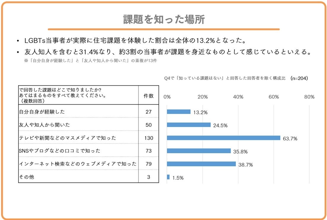 住まい探しの課題を認知しているLGBTs当事者のうち、13.2%が実際に「自分自身が経験した」と回答、「友人・知人から聞いた」割合は24.5%