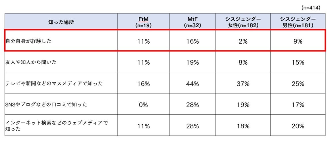 とくにトランスジェンダー女性(MtF)では16%が課題を自分自身で感じており、最も高くなっています。