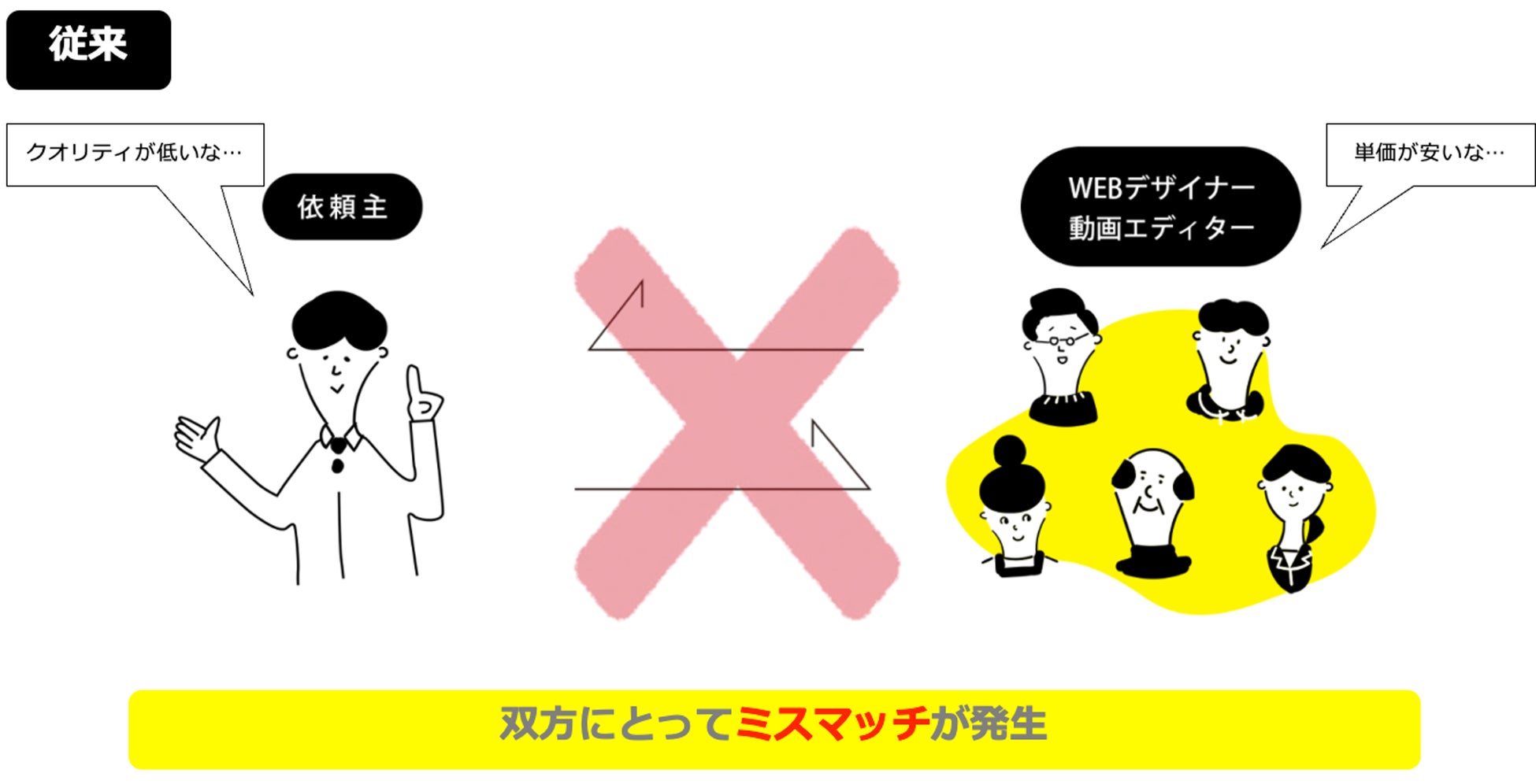従来はクリエイティブ制作を制作会社に依頼した際、その制作会社の制作事例や金額感での発注をするものの、制作会社内でのリソースに合わせた人員選定をするためクオリティが見合ってないケースがありました。
