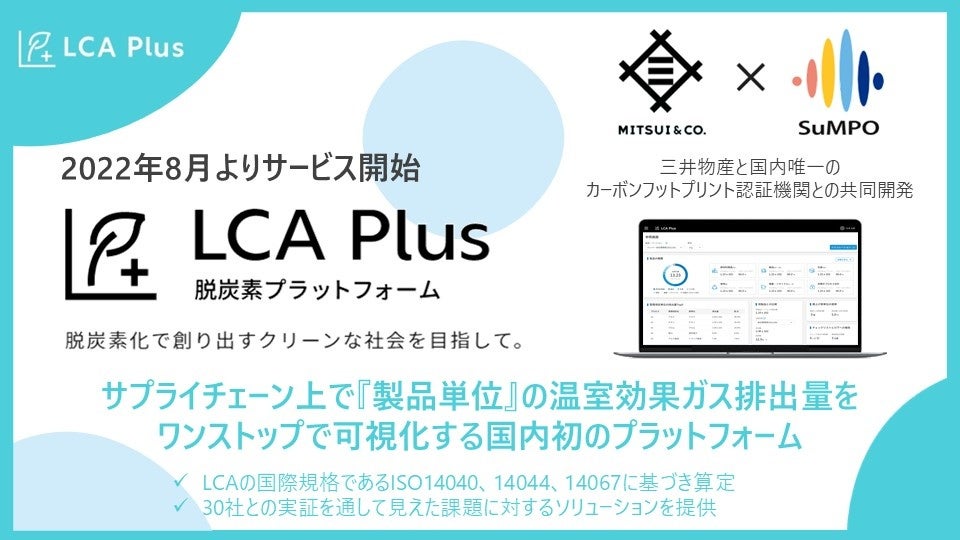 「LCA Plus」は、ライフサイクル思考に基づいた製品の環境マネジメントを可能とするISO14040、ISO14044、ISO14067に基づく算定機能を有した国内初の製品単位のGHG排出量可視化プラットフォームです。三井物産と国内唯一のISOに基づくCFP認証機関であるSuMPOが共同開発し、2022年にサービスを開始しました。これまでに多くの企業に対してLCA/CFPの簡便で正確な可視化に寄与しています。