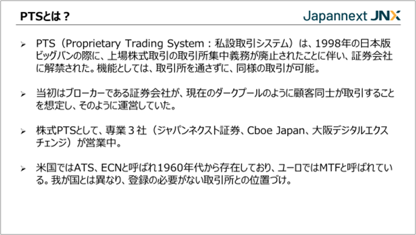 それから、2020年10月に起きた東京証券取引所のシステム障害により全銘柄の取引が終日取引停止となったことにより、PTSを代替市場として位置付ける流れが生まれ、今般の最良執行方針の見直しや、金融審議会の中間整理の中でPTSのより一層の機能向上が検討されることになっています。」