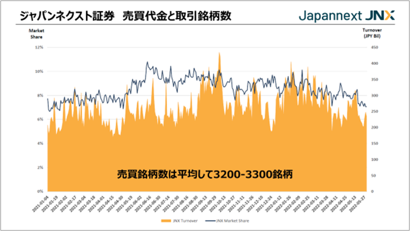 JNX山田CEO 「2006年11月に会社設立、2007年8月にPTSの運営を開始して今年で15年となります。現存の株式PTSの中では、最も歴史があります。2007年開業当時は、夜間取引のみでしたが、現在は昼と夜のマーケットを運営しています。その他、日本国債の電子取引市場も運営しており、株のPTSでは日本最大手となっています。」