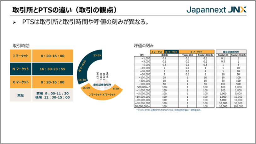 JNX山田CEO 「大きな違いとして、取引所は免許が必要なのに対し、PTSは認可制で証券会社が兼業で運営できます。制度面での違いとしては、PTSが価格決定方法や売買代金シェアにおいて制限されていることです。また、取引の観点からは取引時間や呼び値の刻みが取引所と違い、自由に設定できます。」