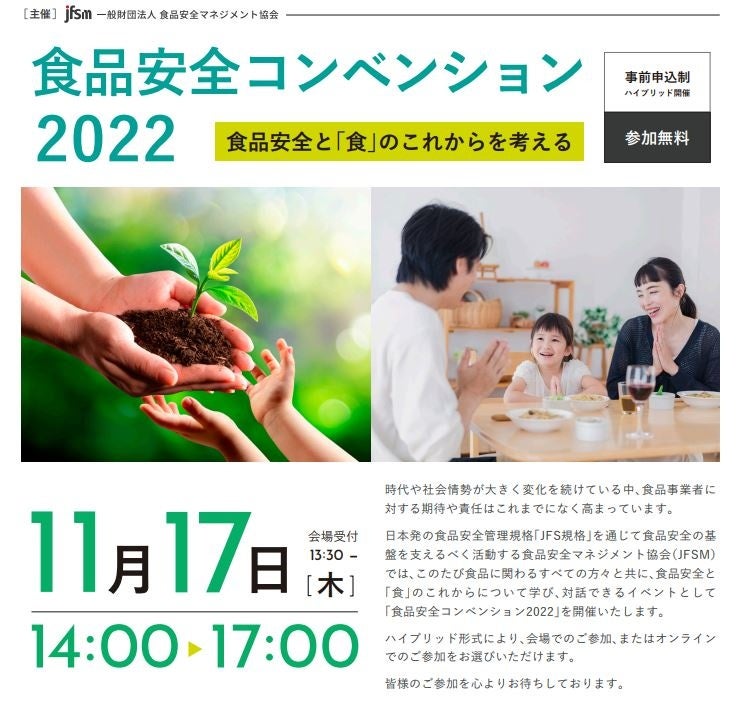 一般財団法人 食品安全マネジメント協会(英語名:Japan Food Safety Management Association:JFSM、所在地:東京都中央区、理事長:大羽 哲郎)は、食品安全と「食」のこれからについて学ぶオンライン×リアルのハイブリッドイベント「食品安全コンベンション2022」を2022年11月17日(木)に東京会場・Zoomウェビナーにて開催致します。