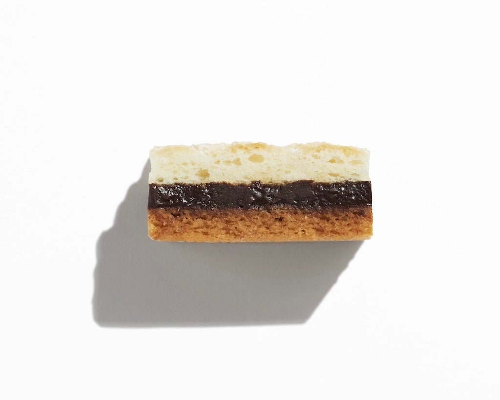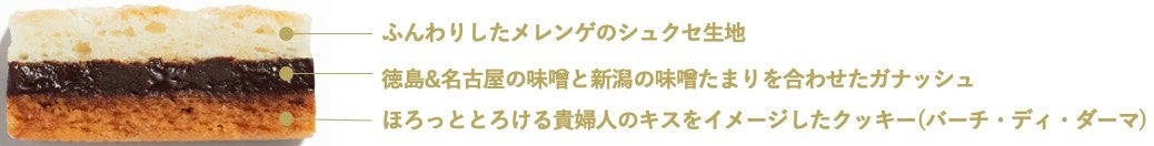 フランスの伝統菓子である、ふんわりしたメレンゲとアーモンドのシュクセ生地に合わせたのは、なんと日本の伝統調味料「味噌」。徳島と名古屋の味噌と、新潟の味噌"たまり"をミルクチョコレートとビターチョコレートに混ぜ合わせ、濃厚なガナッシュに仕立てました。食後のチーズを味わうように、一口で召し上がらずにゆっくり少しずつ、お好きな飲み物とご一緒にお楽しみください。