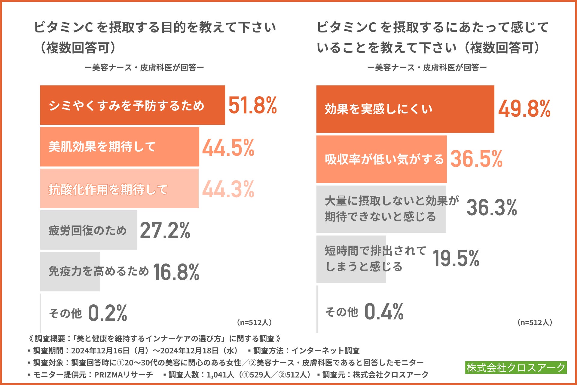 美容ナース・皮膚科医においては、シミやくすみの予防、美肌効果や抗酸化作用の期待を目的として約6割の方がビタミンCを摂取しているようですが、効果を実感しにくい、吸収率が低いなどを感じていることも浮き彫りになりました。