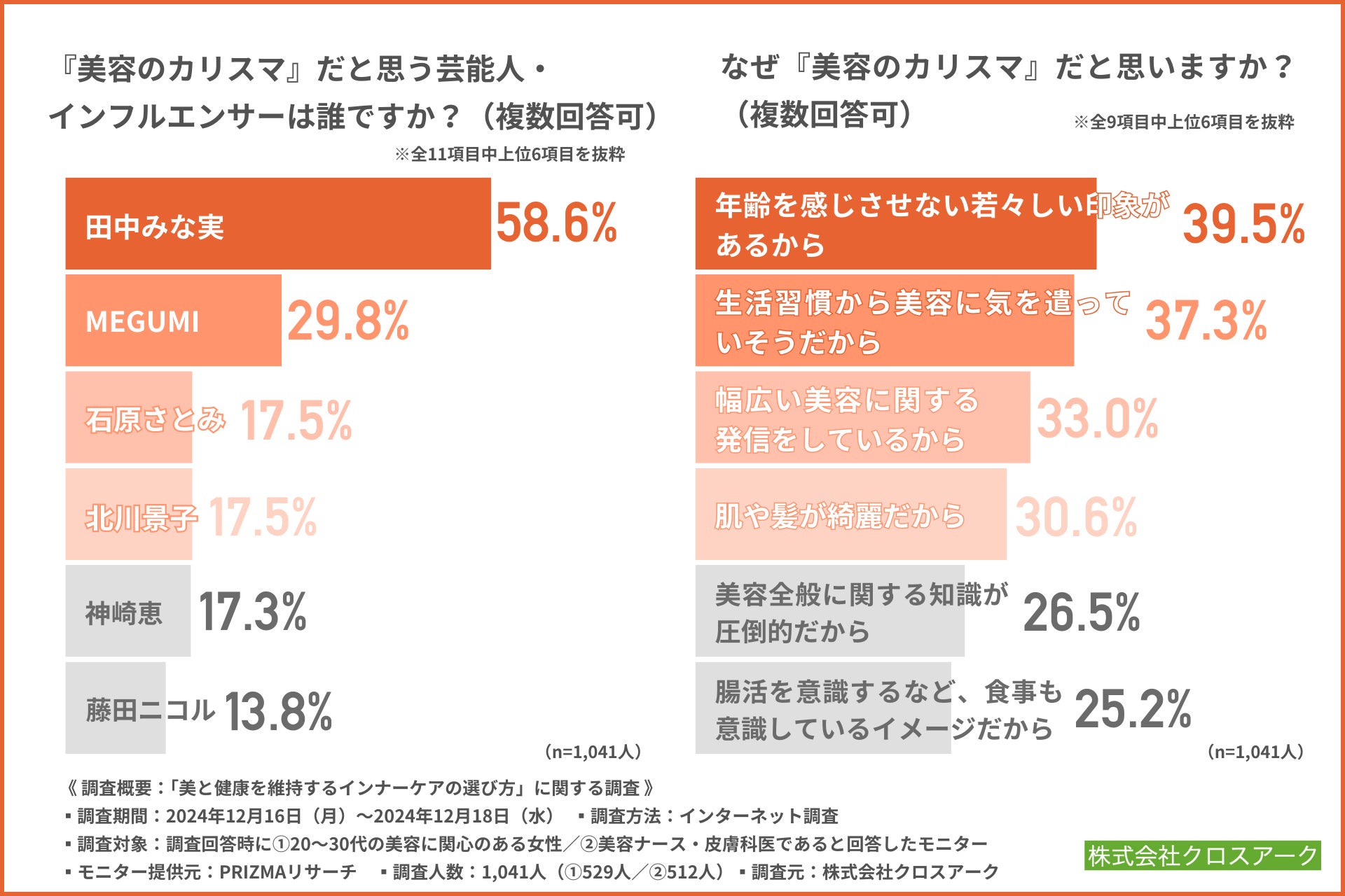 はじめに、「『美容のカリスマ』だと思う芸能人・インフルエンサーは誰ですか?(複数回答可)」と質問したところ、『田中みな実(58.6%)』と回答した方が最も多く、次いで『MEGUMI(29.8%)』『石原さとみ(17.5%)』『北川景子(17.5%)』となりました。