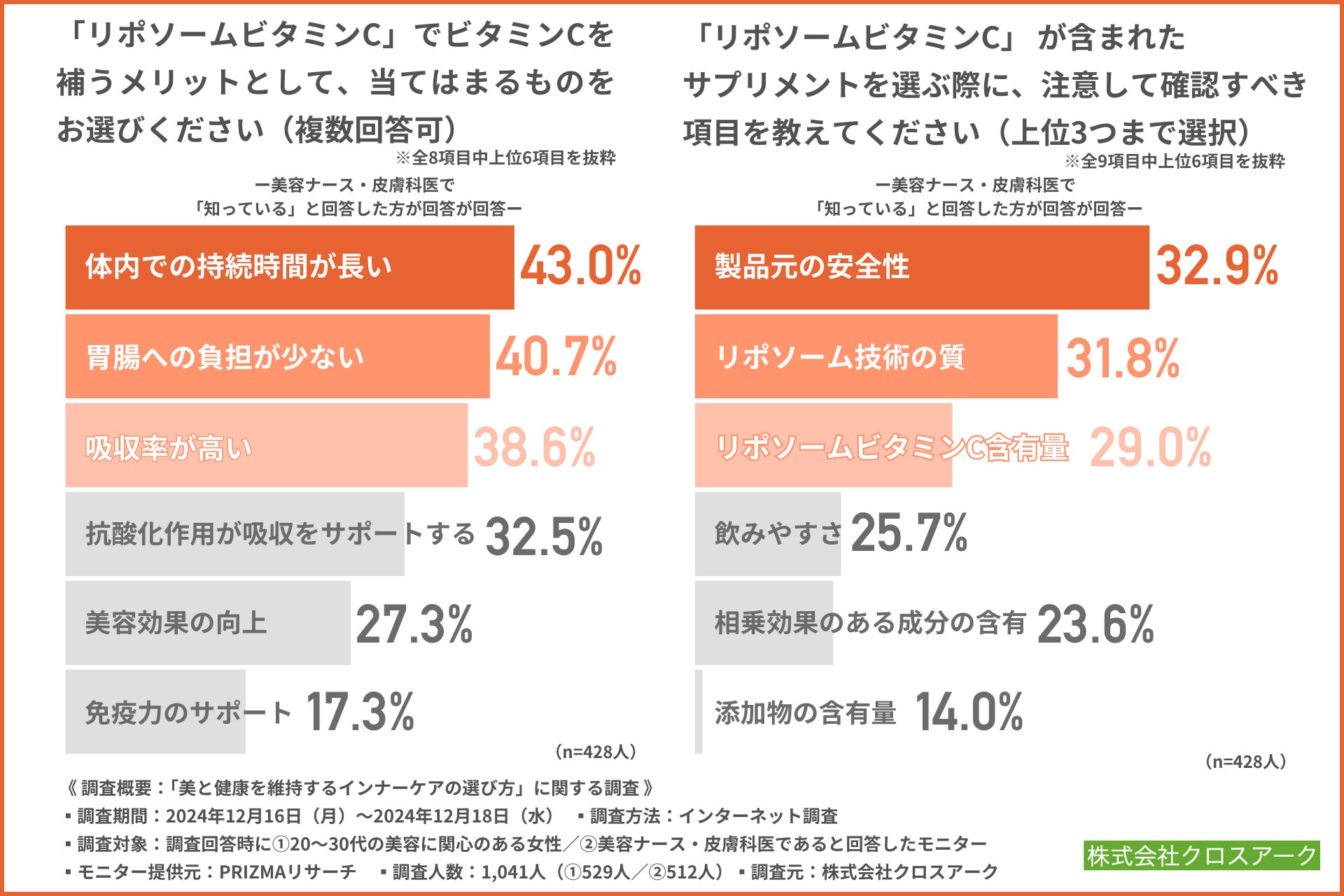 今回、「美と健康を維持するインナーケアの選び方」に関する調査を実施した株式会社クロスアークは、高濃度リポソームビタミンC サプリメント『LipoCin(リポシン)』(https://www.anvita.jp/products/lipocin.html)を販売しています。