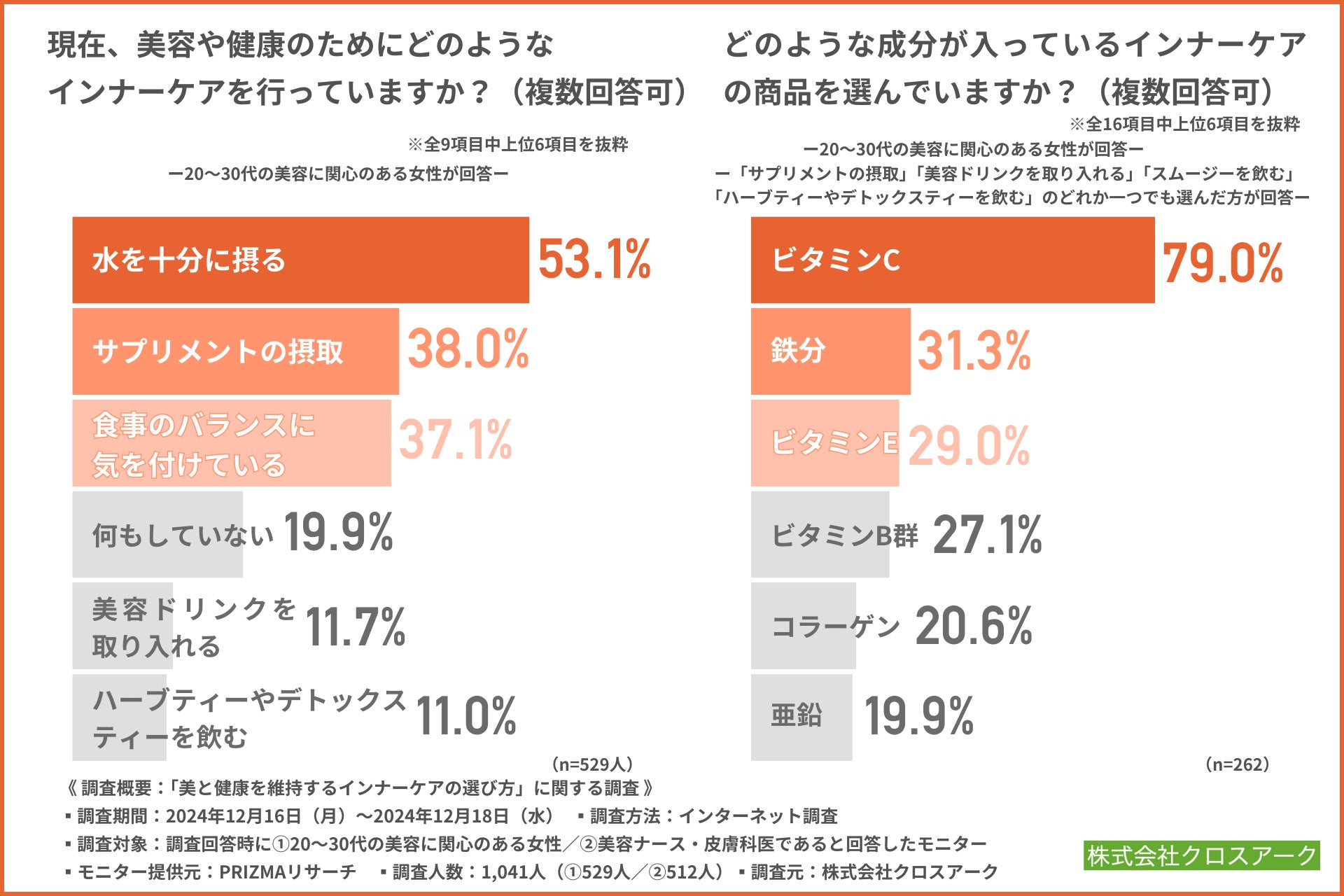 株式会社クロスアーク(所在地:東京都渋谷区)は、①20~30代の美容に関心のある女性/②美容ナース・皮膚科医を対象に、「美と健康を維持するインナーケアの選び方」に関する調査を実施しました。