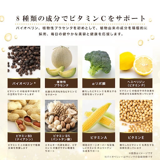 ビタミンCをサポートする成分を8種類(バイオペリン®、植物性プラセンタ、αリポ酸、ヘスペリジン(ビタミンP)、ビタミンB3(ナイアシン)、ビタミンB5(パントテン酸)、ビタミンA、ビタミンE)配合しました。※バイオペリン®はサビンサの登録商標です。