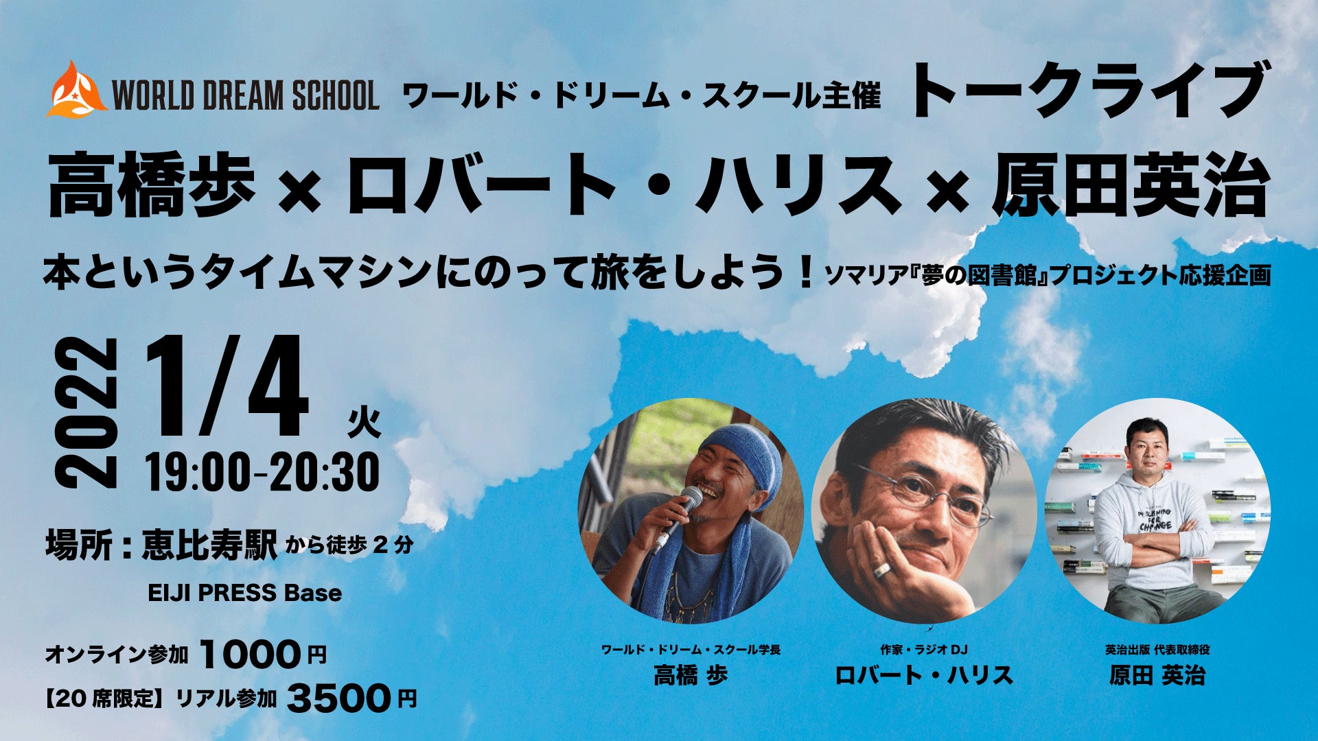 特定非営利活動法人オンザロードが運営するWORLD DREAM SCHOOL (所在地:東京都葛飾区、代表理事:高橋 歩)では、このたび、現在チャレンジ中である(https://camp-fire.jp/projects/view/485870)「ソマリアの刑務所に『夢の図書館』を建てよう!」プロジェクトの応援企画としてロバート・ハリスさんを招き、「本と旅」をテーマにしたスペシャルトークライブを開催することにいたしました。