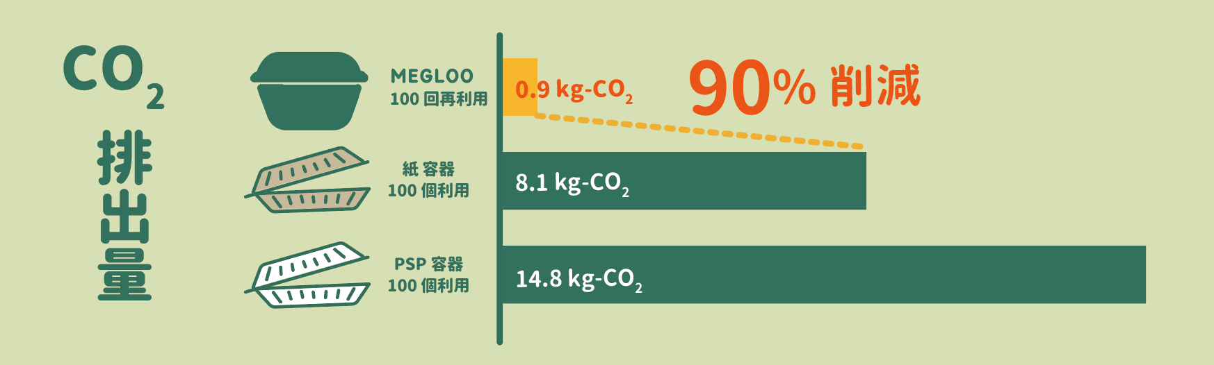 また、Megloo容器と使い捨て紙容器を比較してCO2排出量が9割減少することが、 ライフ・サイクル・アセスメント(Life Cycle Assessment)分析により算出されましたので、公表いたします。